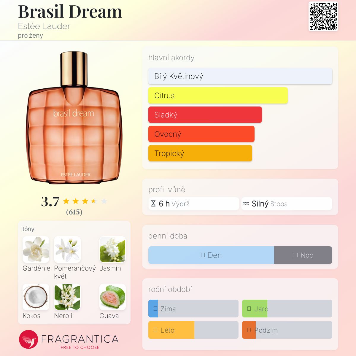 Brasil Dream podle Estée Lauder je Floral Fruity vůně pro ženy. Brasil Dream byl/a uveden/a v roce 2008. Vrchní tóny jsou Květ afrického pomeranče, Neroli, Guava, Pomeranč a Ananas; střední tóny jsouGardénie, Jasmín, Bergamot a Citron amalfi ; základní tóny jsou Kokos, Pačuli a Santalové dřevo.