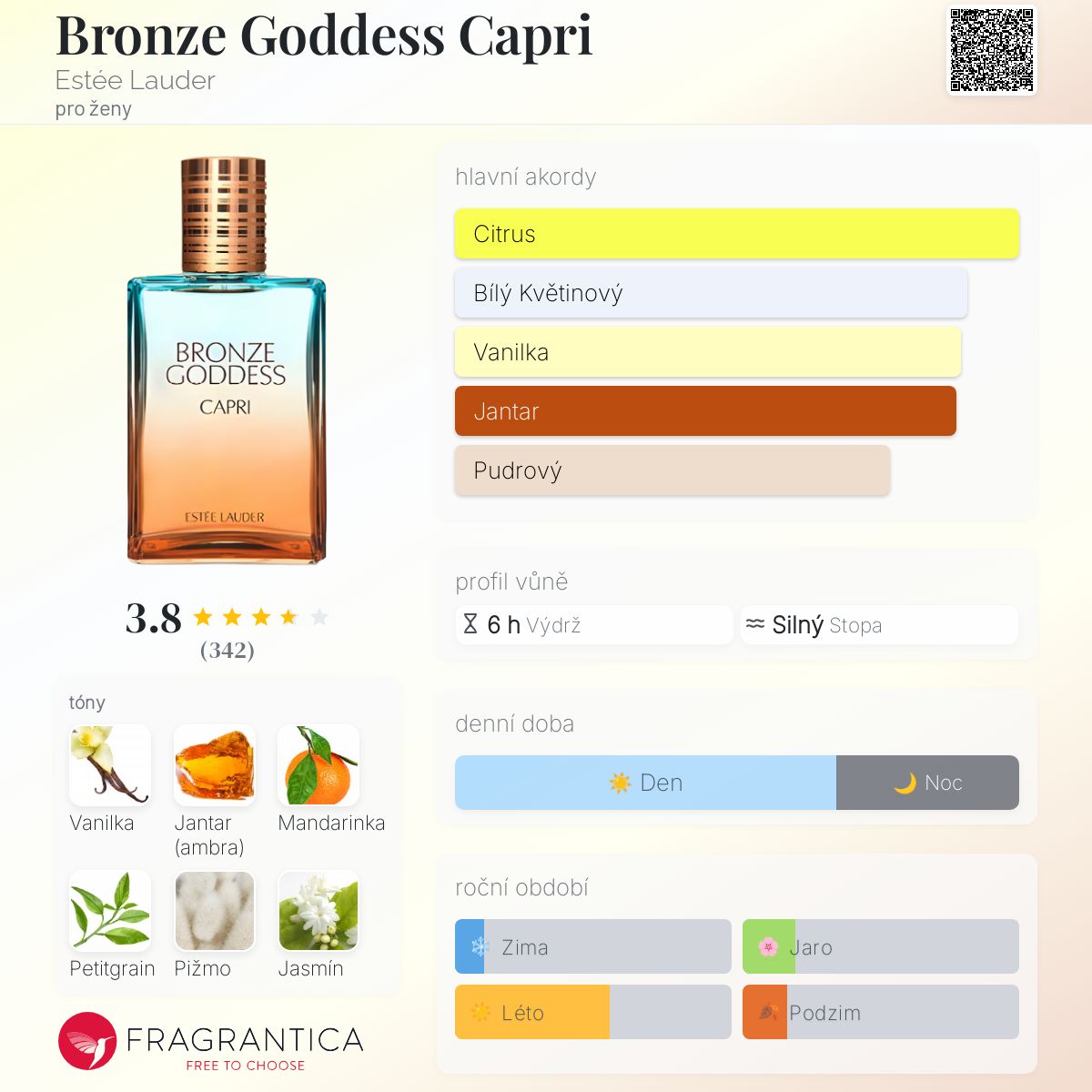 Bronze Goddess Capri podle Estée Lauder je Orientální Floral vůně pro ženy. Bronze Goddess Capri byl/a uveden/a v roce 2012. "Nosem" za touto vůní je Harry Fremont. Vrchní tóny jsou Mandarinka, Petitgrain a Černý rybíz; střední tóny jsouJasmín, Konvalinka a Pivoňka ; základní tóny jsou Vanilka, Jantar (ambra), Pižmo a Pačuli.