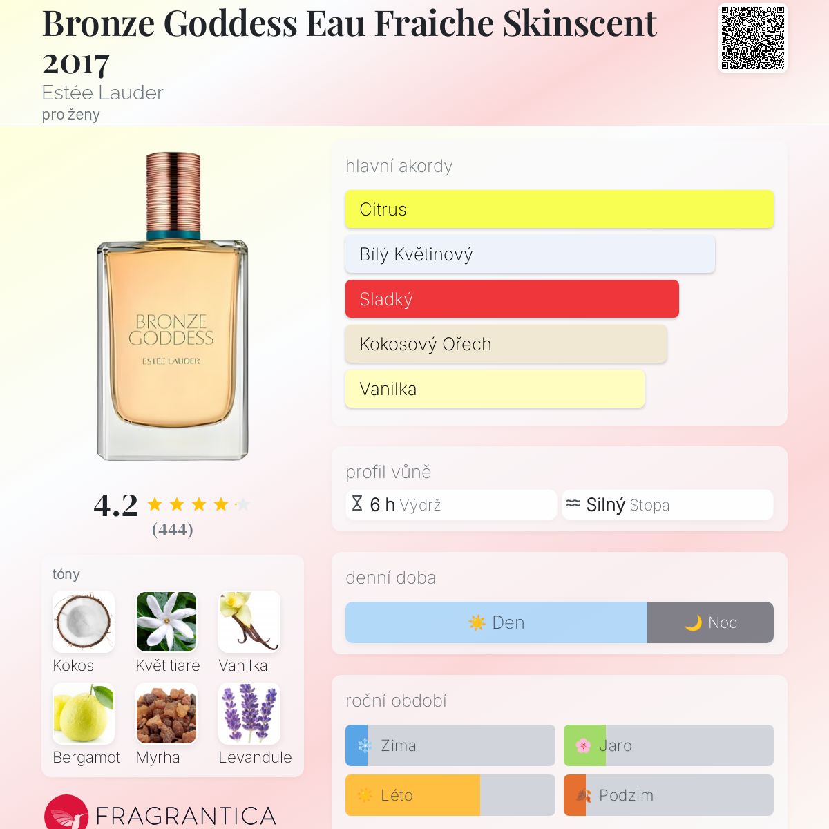 Bronze Goddess Eau Fraiche Skinscent 2017 podle Estée Lauder je Orientální Floral vůně pro ženy. Bronze Goddess Eau Fraiche Skinscent 2017 byl/a uveden/a v roce 2017. Vrchní tóny jsou Bergamot, Mandarinka, Pomeranč a Citrón; střední tóny jsouKvět tiare, Levandule, Pomerančový květ, Magnólie a Jasmín ; základní tóny jsou Kokos, Vanilka, Myrha, Vetiver, Santalové dřevo a Jantar (ambra).