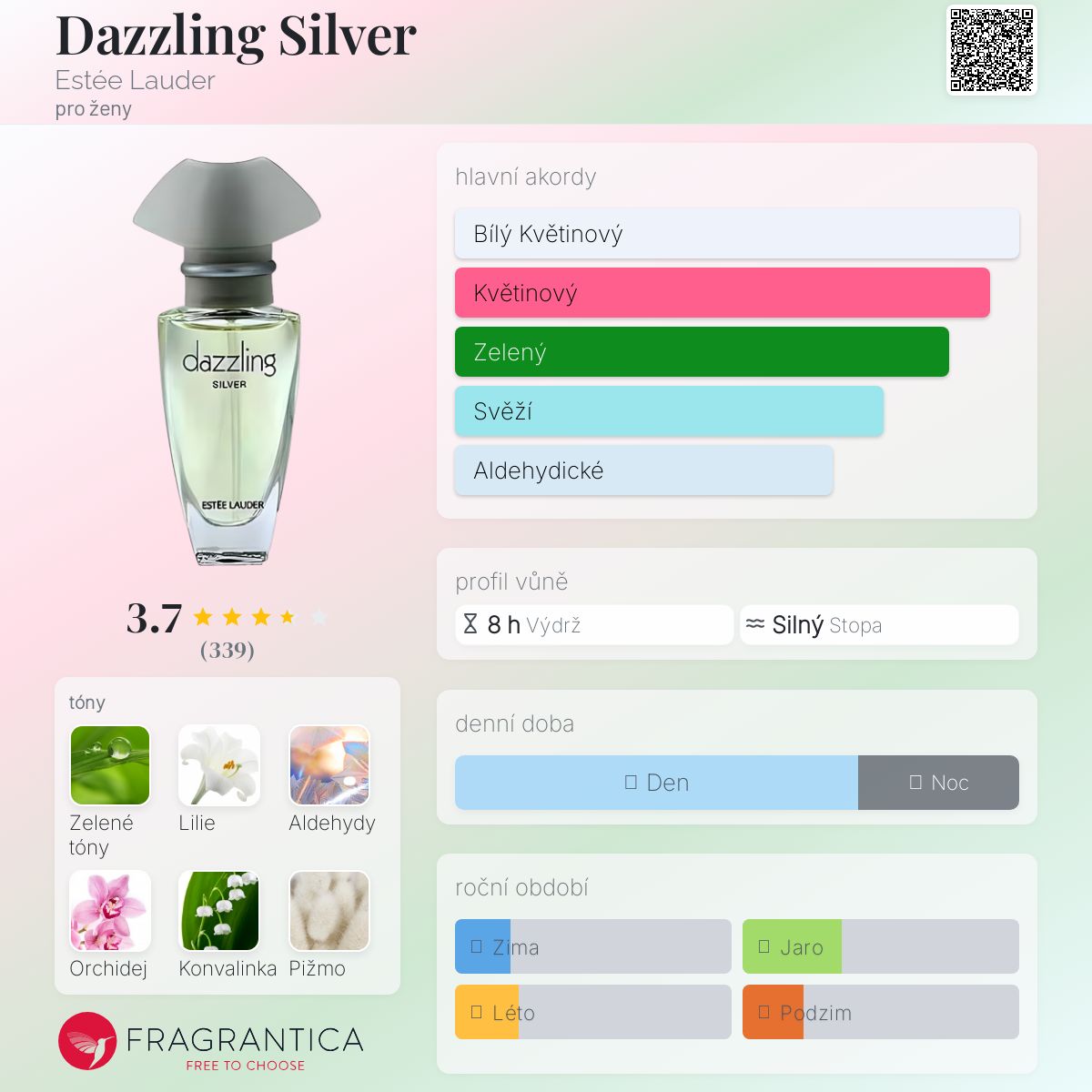 Dazzling Silver podle Estée Lauder je Floral vůně pro ženy. "Nosem" za touto vůní je Evelyn Lauder. Vrchní tóny jsou Zelené tóny, Lilie, Aldehydy, Japonská orchidej, Jablko, Lotus a Vanilka; střední tóny jsouOrchidej, Konvalinka, Jasmín, Růže a Mučenka ; základní tóny jsou Lilie, Pižmo, Magnólie, Cedr, Santalové dřevo a Vanilka.