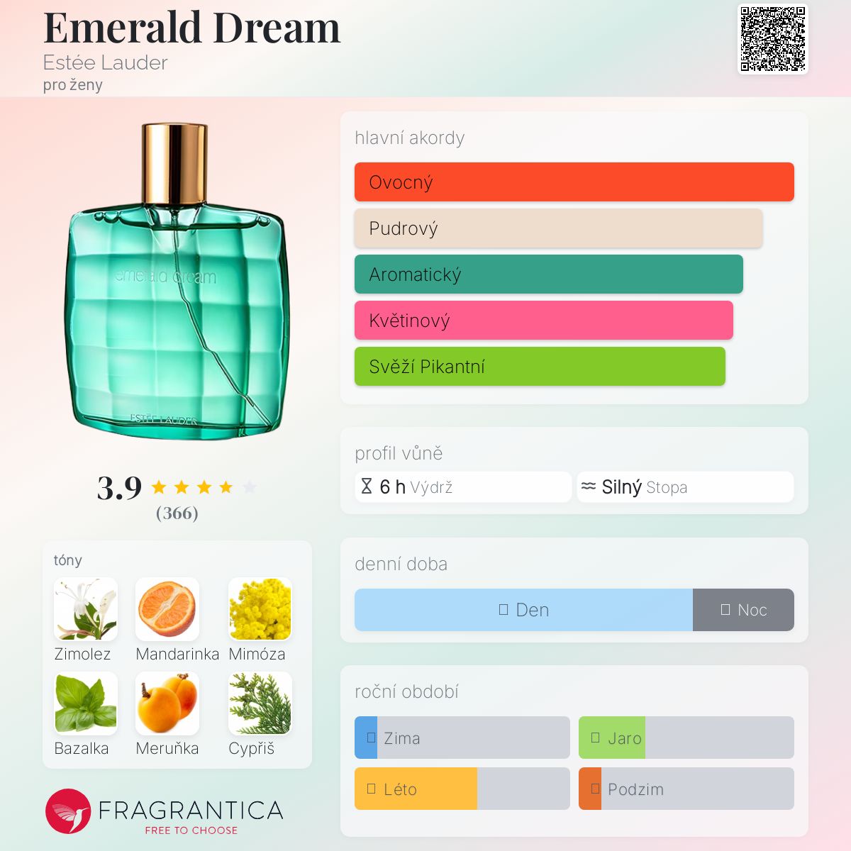 Emerald Dream podle Estée Lauder je Floral vůně pro ženy. Emerald Dream byl/a uveden/a v roce 2006. Vrchní tóny jsou Zimolez, Mandarinka, Bazalka a Meruňka; střední tóny jsouMimóza, Brambořík, Měsíček, Orchidej, Švestka, Kosatec a Fialka ; základní tóny jsou Cypřiš a Santalové dřevo.