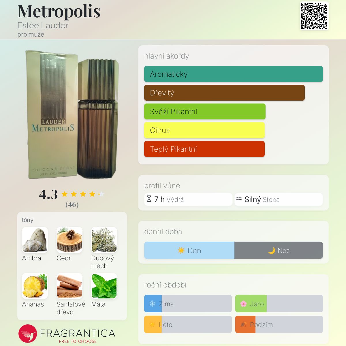 Metropolis podle Estée Lauder je Chypre vůně pro muže. Metropolis byl/a uveden/a v roce 1987. "Nosem" za touto vůní je Pierre Wargnye. Vrchní tóny jsou Ananas, Pikantní máta, Petitgrain, Pomeranč, Mandarinka, Jalovcové bobulky, Levandule a Neroli; střední tóny jsouŠalvěj muškátová, Pelyněk, Hřebíček, Estragon, Skořice, Pelargónie a Karafiát ; základní tóny jsou Ambra, Cedr, Mech, Santalové dřevo, Kůže, Vetiver, Pačuli a Pižmo.