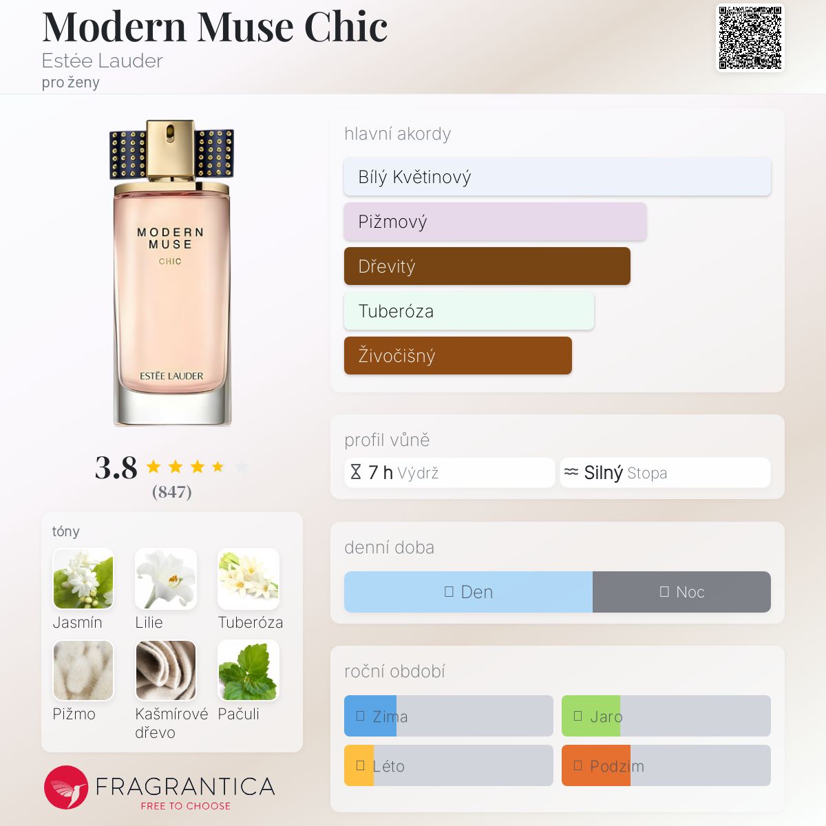 Modern Muse Chic podle Estée Lauder je Floral Woody Musk vůně pro ženy. Modern Muse Chic byl/a uveden/a v roce 2014. Vrchní tóny jsou Švestka a Pelyněk; střední tóny jsouJasmín Sambac, Lilie a Tuberóza ; základní tóny jsou Pižmo, Kašmírové dřevo, Pačuli, Agarové dřevo (oud), Semiš, Ebenový strom, Labdanum a Madagaskarská vanilka.