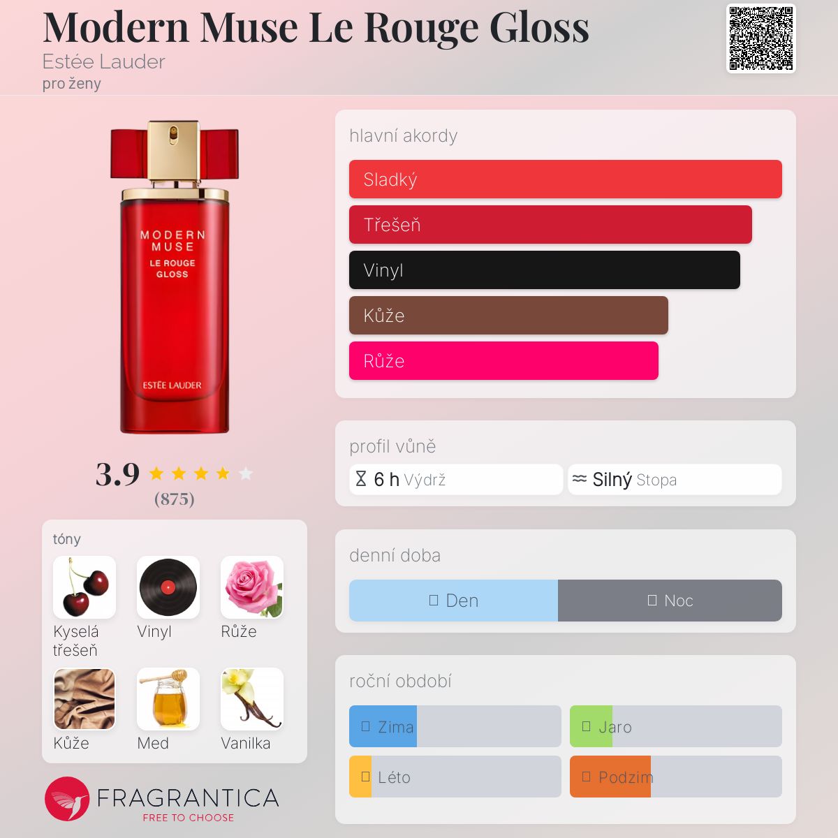 Modern Muse Le Rouge Gloss podle Estée Lauder je Chypre Fruity vůně pro ženy. Modern Muse Le Rouge Gloss byl/a uveden/a v roce 2016. Vrchní tóny jsou Kyselá třešeň, Semena mrkve, Růžový pepř a Mandarinka; střední tóny jsouVinyl, Růže, Kůže a Jasmín ; základní tóny jsou Med, Vanilka, Šafrán, Pačuli, Styrax a Labdanum.