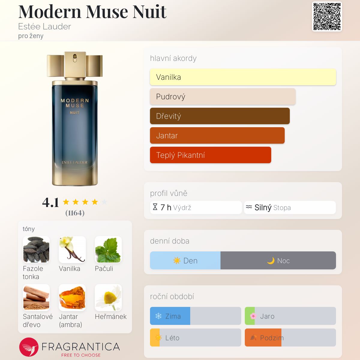 Modern Muse Nuit podle Estée Lauder je Orientální Woody vůně pro ženy. Modern Muse Nuit byl/a uveden/a v roce 2016. Vrchní tóny jsou Černý rybíz a Mandarinka; střední tóny jsouHeřmánek, Otočník, Jasmín a Čínský jasmín ; základní tóny jsou Fazole tonka, Madagaskarská vanilka, Pačuli, Santalové dřevo, Jantar (ambra) a Pižmo.