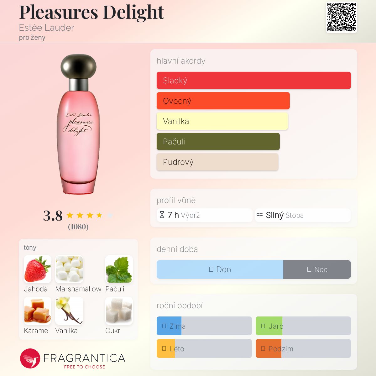 Pleasures Delight podle Estée Lauder je Floral Fruity Gourmand vůně pro ženy. Pleasures Delight byl/a uveden/a v roce 2007. Vrchní tóny jsou Jahoda, Granátové jablko, Frézie a Zelené tóny; střední tóny jsouPivoňka, Lilie, Otočník a Konvalinka ; základní tóny jsou Marshamallow, Pačuli, Karamel, Vanilka, Cukr a Růže.