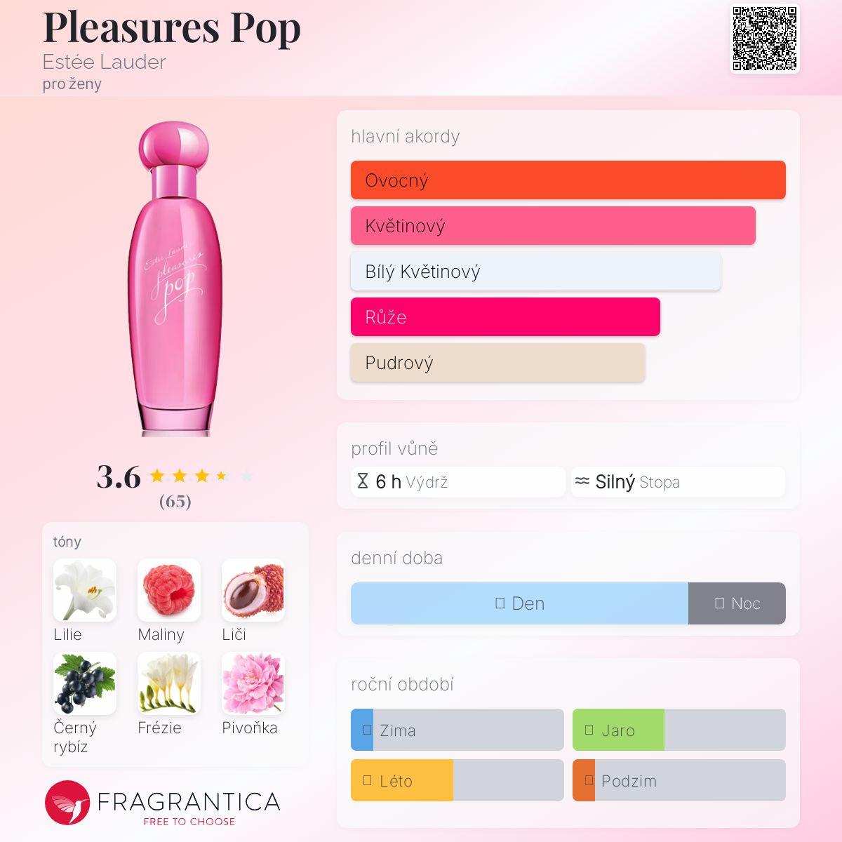 Pleasures Pop podle Estée Lauder je Floral Fruity vůně pro ženy. Pleasures Pop byl/a uveden/a v roce 2013. Vrchní tóny jsou Maliny, Liči, Černý rybíz, Frézie a Růžový grapefruit; střední tóny jsouLilie, Růžová pivoňka, Růže a Jasmín ; základní tóny jsou Pižmo, Otočník, Cedr, Vanilka, Benzoin a Cashalox.