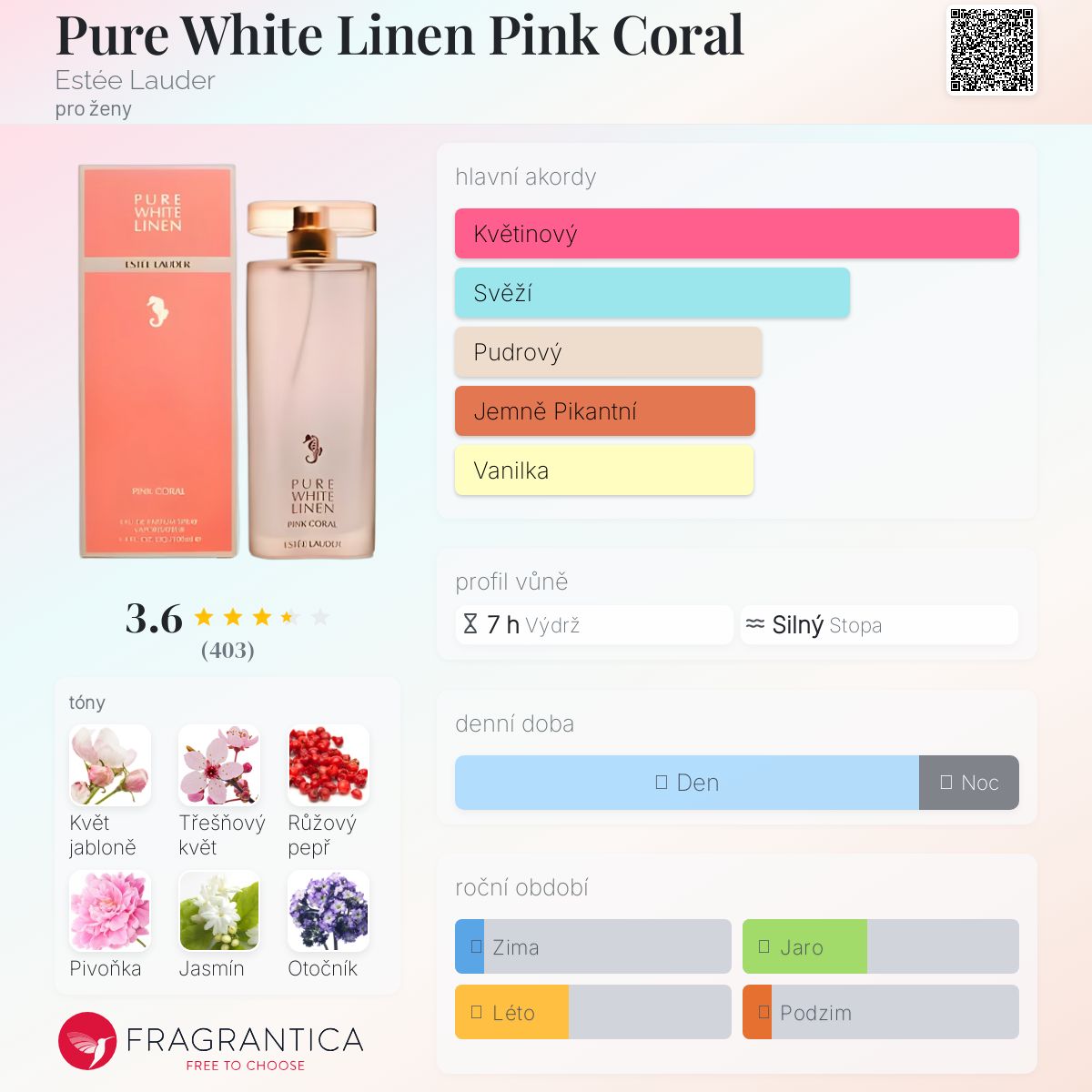 Pure White Linen Pink Coral podle Estée Lauder je Floral vůně pro ženy. Pure White Linen Pink Coral byl/a uveden/a v roce 2009. "Nosem" za touto vůní je Christophe Laudamiel. Vrchní tóny jsou Květ jabloně a Růžový pepř; střední tóny jsouTřešňový květ, Pivoňka a Jasmín ; základní tóny jsou Otočník, Santalové dřevo a Vanilka.