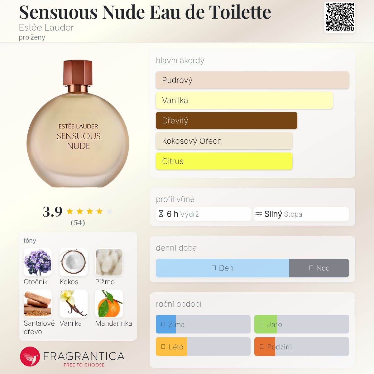 Sensuous Nude Eau de Toilette podle Estée Lauder je Floral Woody Musk vůně pro ženy. Sensuous Nude Eau de Toilette byl/a uveden/a v roce 2012. Vrchní tóny jsou Mandarinka, Sicilský bergamot, Černý pepř a Růžový pepř; střední tóny jsouKokosové mléko, Pižmo, Med, Konvalinka a Jasmín ; základní tóny jsou Otočník, Pižmo, Santalové dřevo, Vanilka, Dřevité tóny a Jantar (ambra).