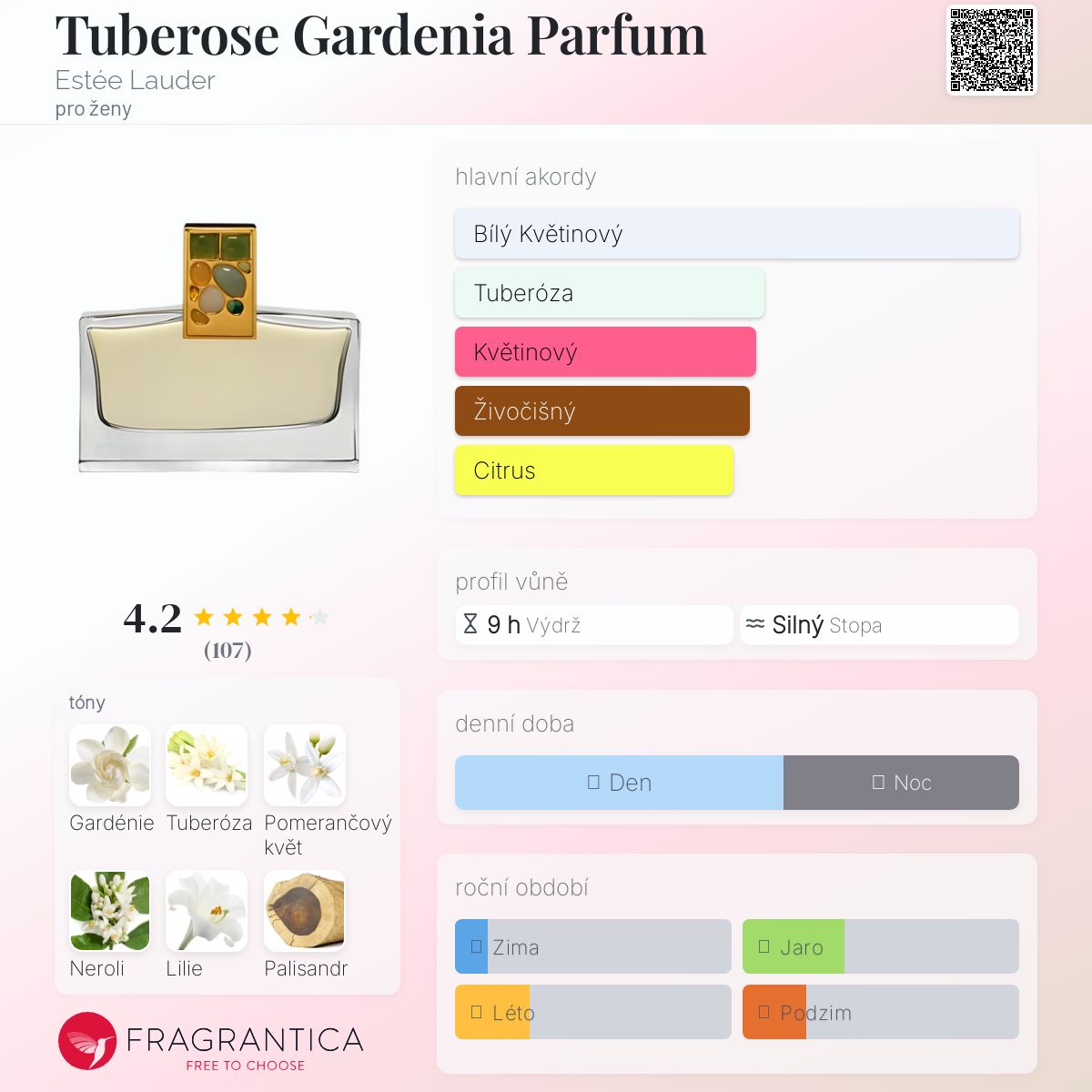 Tuberose Gardenia Parfum podle Estée Lauder je Floral vůně pro ženy. Tuberose Gardenia Parfum byl/a uveden/a v roce 2007. Vrchní tóny jsou Neroli, Palisandr a Šeřík; střední tóny jsouGardénie, Tuberóza, Pomerančový květ, Lilie a Jasmín ; základní tóny jsou Bourbonská vanilka a Karafiát.