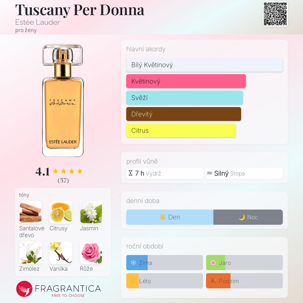 Tuscany Per Donna podle Estée Lauder je vůně pro ženy. Tuscany Per Donna byl/a uveden/a v roce 2015. Vrchní tóny jsou Citrusy, Růže, Konvalinka a Bylinné tóny; střední tóny jsouJasmín, Zimolez, Karafiát a Pivoňka ; základní tóny jsou Santalové dřevo, Vanilka a Jantar (ambra).