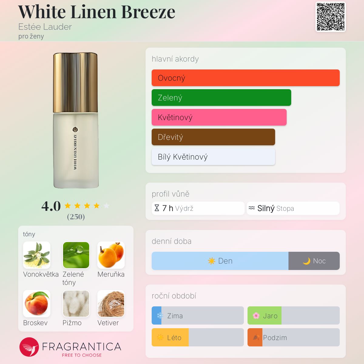 White Linen Breeze podle Estée Lauder je Floral Aldehyde vůně pro ženy. Vrchní tóny jsou Zelené tóny, Meruňka, Broskev, Švestka a Bergamot; střední tóny jsouKonvalinka, Jasmín a Růže ; základní tóny jsou Vonokvětka, Pižmo, Vetiver, Cedr a Jantar (ambra).