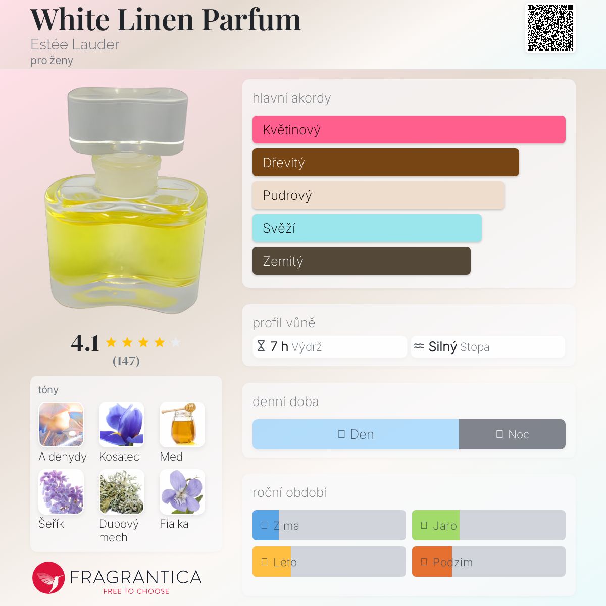 White Linen Parfum podle Estée Lauder je Floral vůně pro ženy. White Linen Parfum byl/a uveden/a v roce 1978. "Nosem" za touto vůní je Sophia Grojsman. Vrchní tóny jsou Aldehydy, Citrón a Broskev; střední tóny jsouKosatec, Šeřík, Fialka, Ylang-Ylang, Konvalinka, Hyacint, Karafiát, Orris, Orchidej, Růže a Jasmín ; základní tóny jsou Med, Dubový mech, Cedr, Jantar (ambra), Vetiver, Benzoin, Fazole tonka a Santalové dřevo.