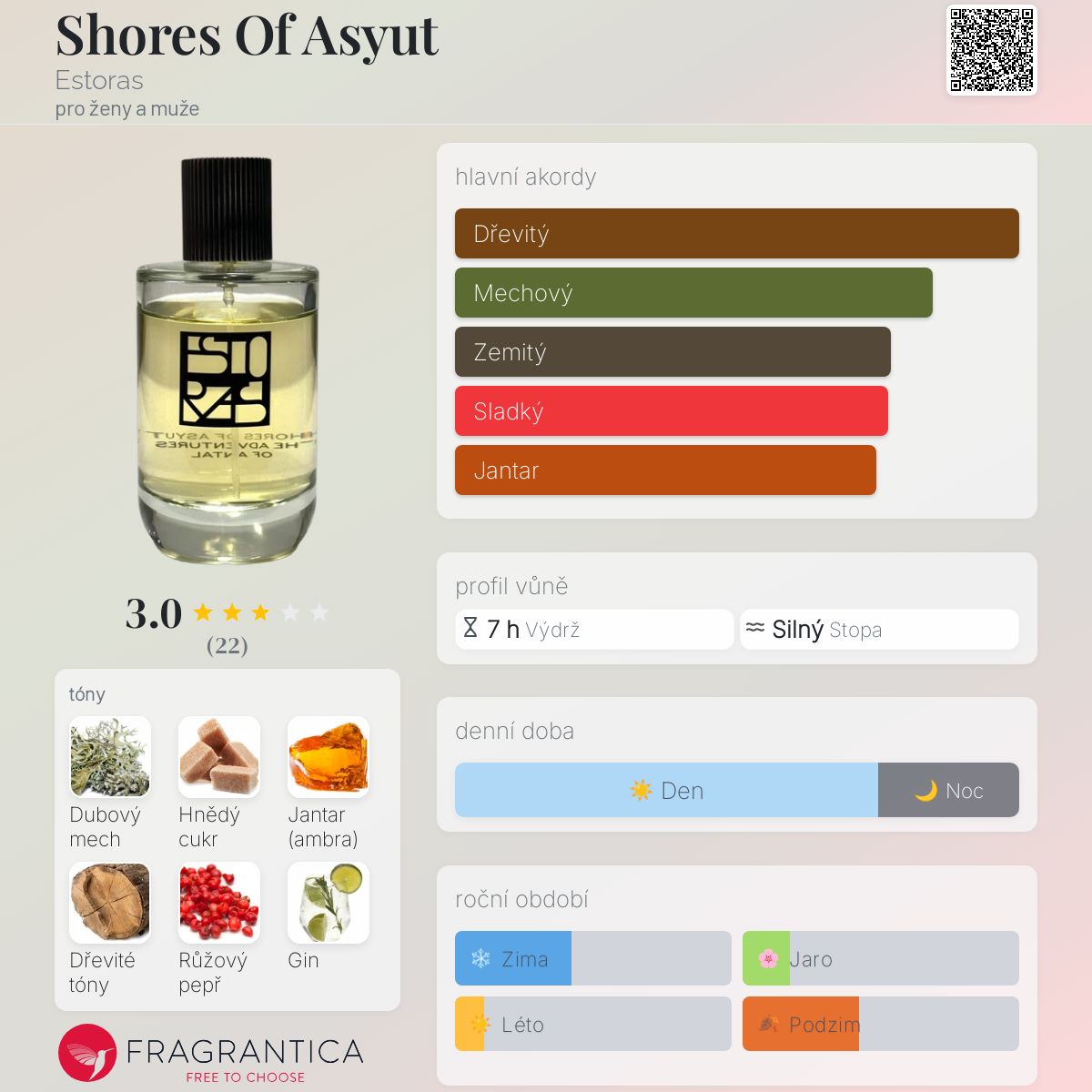 Shores Of Asyut podle Estoras je Orientální Woody vůně pro ženy a muže. Toto je nová vůně. Shores Of Asyut byl/a uveden/a v roce 2025. Vrchní tóny jsou Růžový pepř, Gin a Černý pepř; střední tóny jsouFialkový list, Orris a Tuberóza ; základní tóny jsou Mech, Hnědý cukr, Jantar (ambra) a Dřevité tóny.