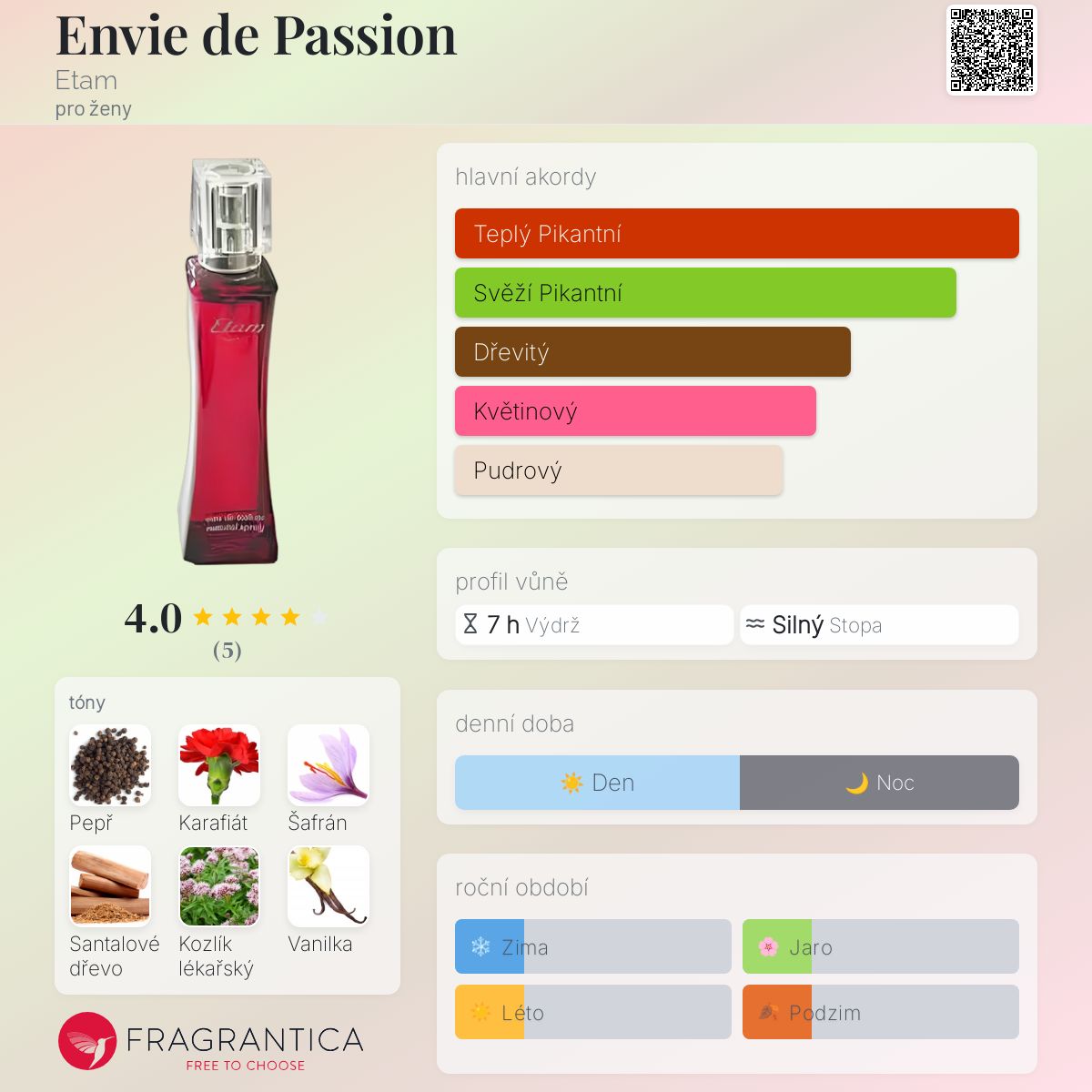 Envie de Passion podle Etam je vůně pro ženy. Vrchní tóny jsou Pepř, Bergamot a Růže; střední tóny jsouKarafiát, Šafrán, Kozlík lékařský a Ylang-Ylang ; základní tóny jsou Santalové dřevo, Vanilka, Cedr a Pižmo.