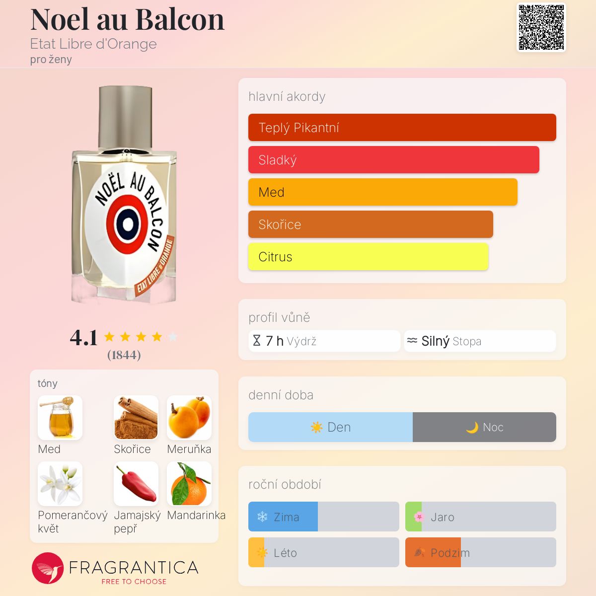 Noel au Balcon je hřejivou náručí v zimě. Voní jako rodinný dům, kde se peče dezert. Voní po orientálních sladkostech s medem a skořicí, které jsou oslazené nějakým ovocem (u nás meruňkami nebo v Americe meruňkami). Je jednoduchá, přirozená, chutná a okouzlující.