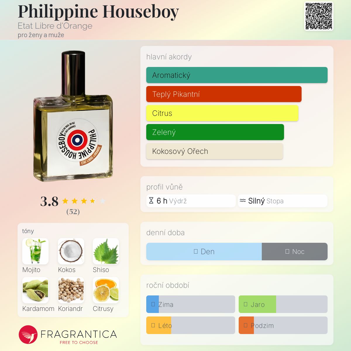 Philippine Houseboy podle Etat Libre d'Orange je Aromatic Fougere vůně pro ženy a muže. Philippine Houseboy byl/a uveden/a v roce 2012. "Nosem" za touto vůní je Ralf Schwieger.
