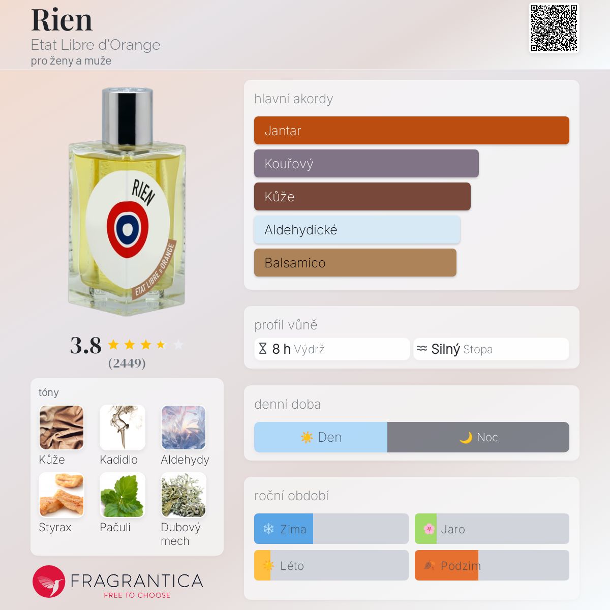 70. léta, Londýn, pankáči. Vivienne Westwoodová jako první vyrazila do ulic s takzvanými "ostnatými vlasy", které se později staly klasickým účesem tohoto hnutí. Patti Smithová vydává své debutové album Horses, které se stane legendárním a přímo ovlivní punkovou hudbu vydanou po něm. Susie Sue si mezitím mezi tím vším domluví jízdu v MHD bez sukní, aby nemusela platit jízdné. A to je teprve začátek cesty každé z těchto velkých žen, pokud počítáme zpětně až do 70. let. Ale co to má společného s nimi a vůní Rien od Etat Libre d'Orange? Už jen proto, že obsahuje a odráží všechny výše zmíněné a ještě více. Nejzajímavější a skutečně jedinečná kompozice v rámci rodiny chypre. Je tak filigránsky vytvořená, že je nesmírně obtížné vyčlenit něco samostatného. Ale pokud se o to pokusíte, symbióza bude zřejmá: pronikavé kovově krvavé a městské aldehydy nové generace, které Antoine Lee tak vroucně miluje; měkká a živočišná surová kůže; hořké a trpké rituální kadidlo; temný a suchý dubový mech frakce dřeva, na který je navlečen zbytek, kolem něhož se všechny složky víří ve víru. A tentýž ponurý mechový základ je skutečnou propastí: pokud se do něj podíváte, určitě se podívá i do vás. Tím však složky Rienovy kompozice nekončí. Někde mezi bezešvými vrstvami se skrývají bizarní a neméně suché a ponuré květy fialky ležící na vínovém semiši, další balzamické a pryskyřičné odstíny, kořeněný blok v podobě černého pepře a kmínu a samozřejmě charakteristická guma a latex ELdO, díky nimž vůně získává fyziologické tóny a splývá s pokožkou. Rien je tedy hořkosladký mechový chypre s dominantním propojením kadidla a kůže s aldehydem, díky němuž je také kouřově hořící, živočišný a kovově krvavý. Technické vlastnosti Rien nezaostávají za jeho zvukem a jsou referenční. Parfém žije na kůži více než 24 hodin a je v patřičné míře slyšitelný pro vaše okolí. Jeden z nejlepších počinů Etat Libre d'Orange a samotného Antoina Lee, ne-li vůbec nejlepší. Geniální, mistrovské a nezapomenutelné dílo. Můj nejlepší nález, moje druhá kůže, moje "Voňavé já".