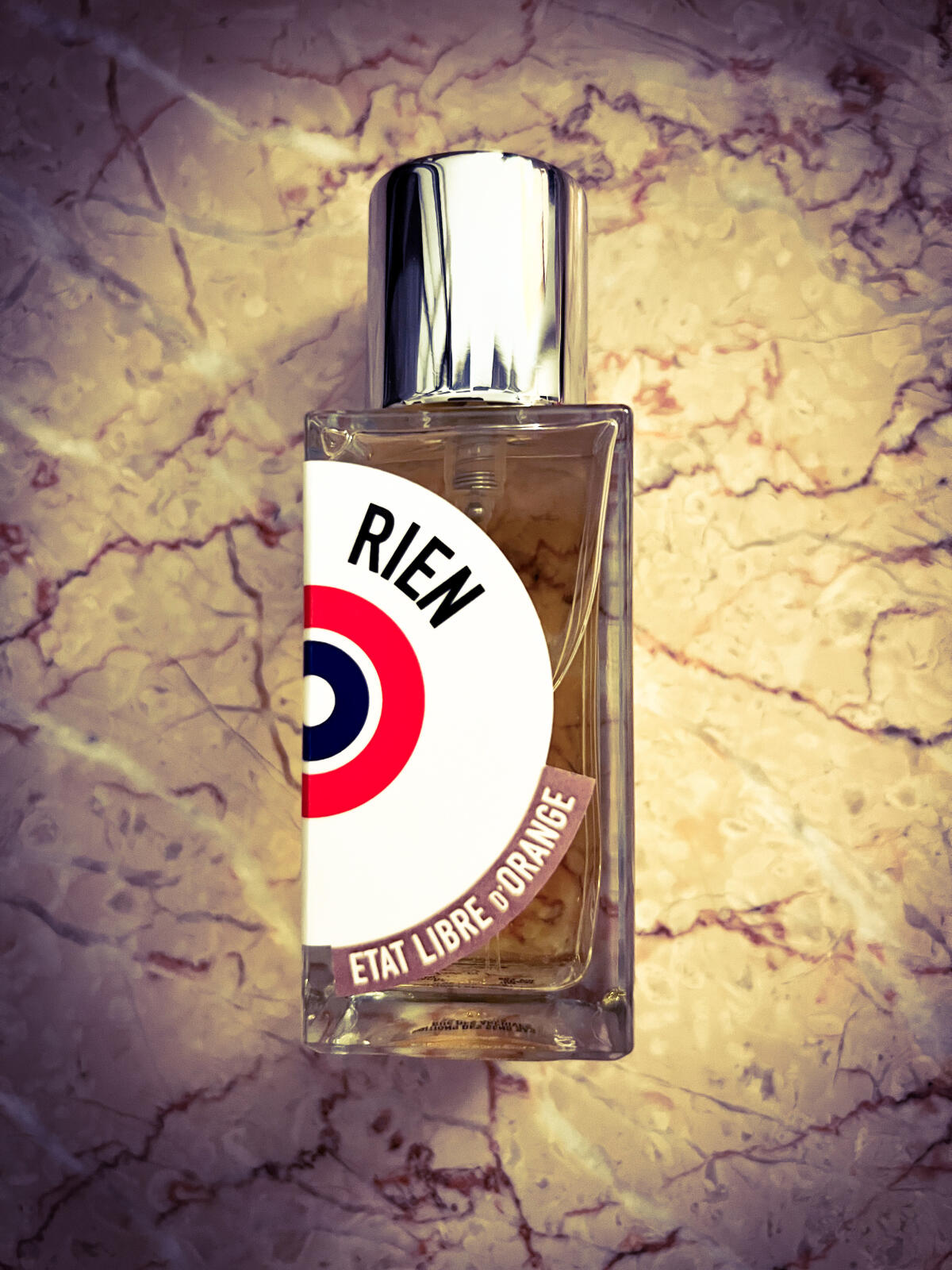 Rien (nic) je eminentně vintage vůně. Pokud máte rádi sladkosti, froutchuleríos nebo čokoládové tonky, nenajdete zde nic podle svého gusta, protože je od samého začátku situována jako špinavý a hrubý parfém. Špinavost rien je stejná jako špinavost čerstvě vykydaného koňského trusu. Kdo měl osla nebo jakéhokoli koňáka, ví, o čem mluvím, zvířecí exkrementy jsou obvykle nechutné a s několika nuancemi, které lze v poezii ztvárnit, psí nebo kočičí hovno je prostě zvracení kvůli své měkké povaze, vyměšované a otravné věci, špíny. Ale koňské hovno, které je krmeno slámou, krmivem a trávou, má suchou, travnatou, prašnou kvalitu. Vyrostl jsem se zvířaty z celého spektra Noemovy archy a vzpomínám si, jak jsem ho přímo sbíral rukama, když soused přišel požádat o hnojivo pro rostliny, protože na rozdíl od rozmočených a nechutných výkalů jiných savců koňské hovno téměř vůbec nešpiní. A co víc, po několika hodinách jsou suché a dokonce je vidět, jak na jejich složení ulpívají stébla krmiva. Rienův ultrazvířecí tón jde touto cestou, přes stáje, stáje a stáje. To jej přímo spojuje s koženým akordem velkých francouzských klasiků z poloviny minulého století, kůží s reminiscencemi na stáje a s kilogramy izobutylochinolinu, molekuly, která tuto vůni znovu vytváří. Z toho je jasné, že Rien není pro všechny diváky, je to přísná, živočišná a primitivní katolická mystika, bez jakékoliv sladkosti.