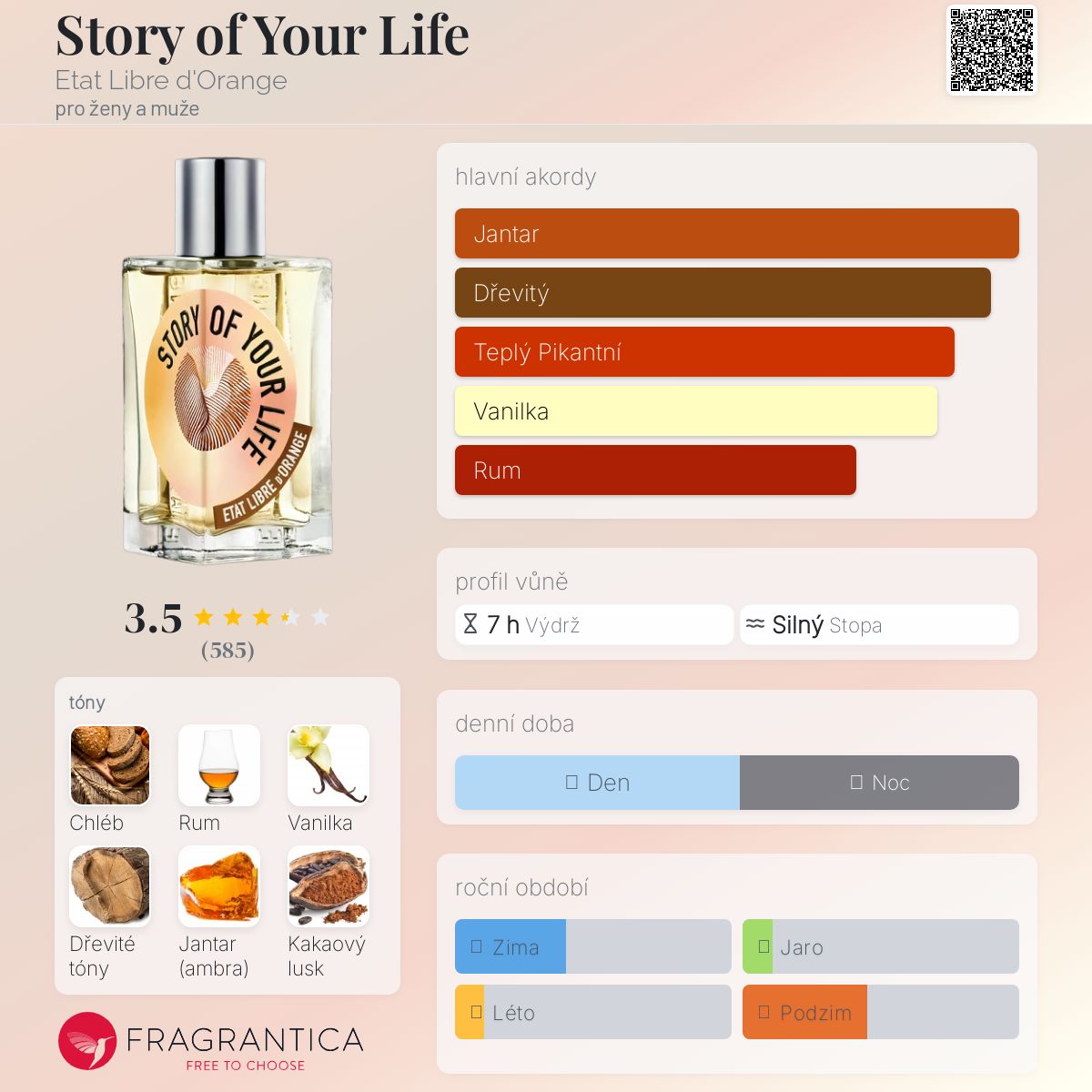 Story of Your Life podle Etat Libre d'Orange je vůně pro ženy a muže. Toto je nová vůně. Story of Your Life byl/a uveden/a v roce 2024. Vrchní tóny jsou Benzoin a Davana; střední tóny jsouChléb a Pomerančový květ ; základní tóny jsou Rum, Vanilka, Dřevité tóny, Jantar (ambra), Kakao a Pačuli.