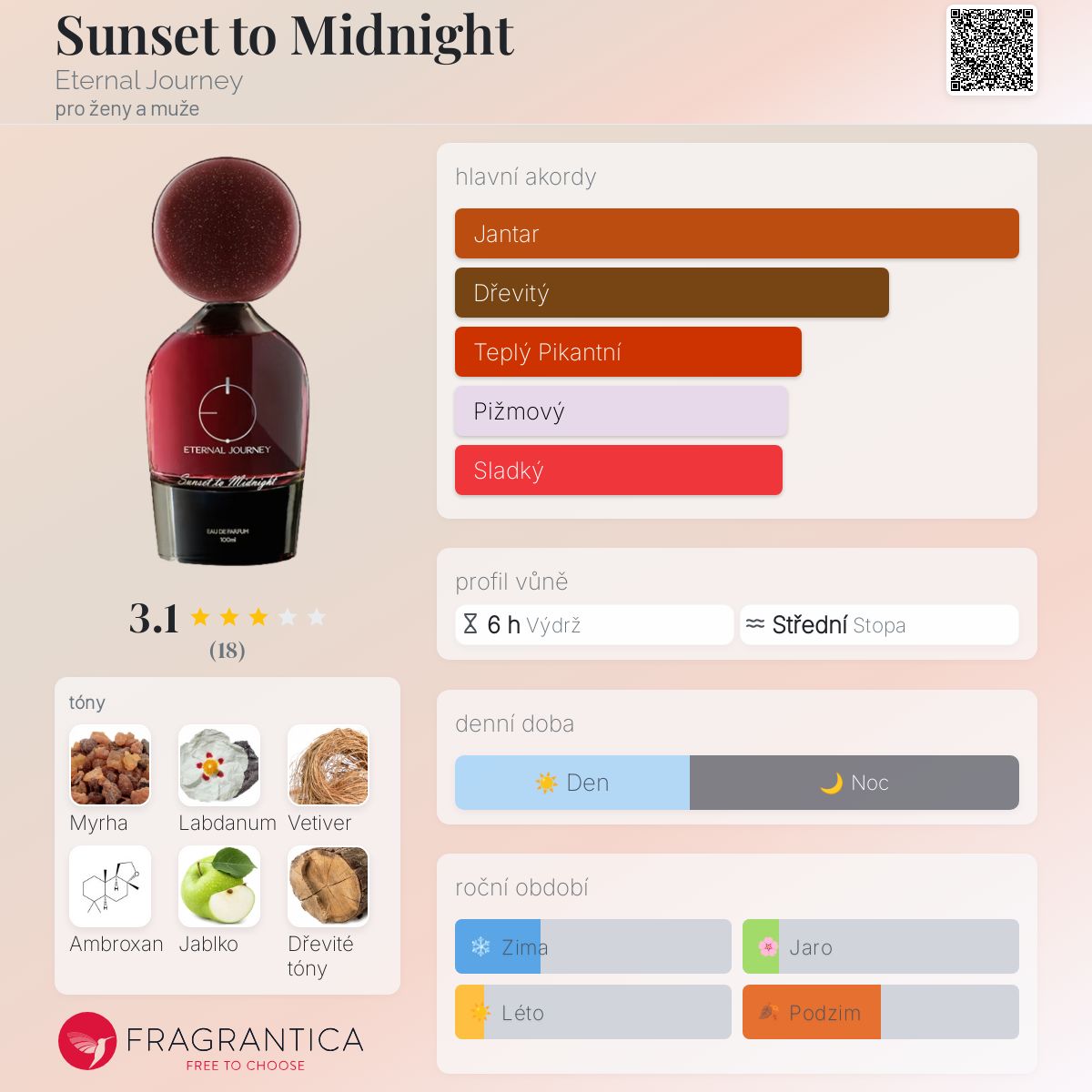 Sunset to Midnight podle Eternal Journey je Orientální Woody vůně pro ženy a muže. Sunset to Midnight byl/a uveden/a v roce 2023. Sunset to Midnight byl/a vytvořen/a Pierre Ravan, Ilias Ermenidis a Hamid Merati-Kashani. Vrchní tóny jsou Labdanum, Jablko, Rum, Skořice a Orris; střední tóny jsouMyrha, Vetiver, Dřevité tóny, Sladké tóny, Marshmallow, Kadidlo a Šafrán ; základní tóny jsou Ambroxan, Cypriolový olej, Pižmo, Clearwood, Pačuli a Helvetolide.