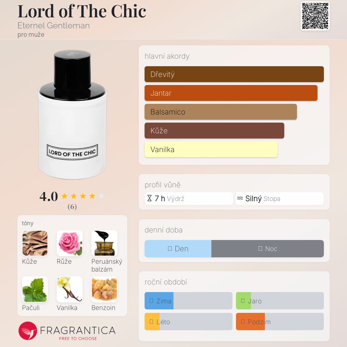 Lord of The Chic podle Eternel Gentleman je Orientální vůně pro muže. Lord of The Chic byl/a uveden/a v roce 2017. Vrchní tóny jsou Kůže, Růže a Peruánský balzám; střední tóny jsouPačuli, Papyrus a Vetiver ; základní tóny jsou Vanilka, Peruánský balzám, Benzoin, Olibanum, Pižmo a Dubový mech.