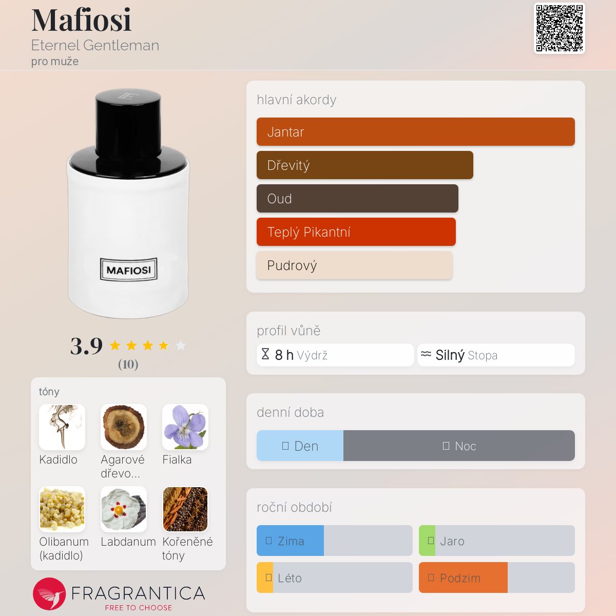Mafiosi podle Eternel Gentleman je Orientální Woody vůně pro muže. Mafiosi byl/a uveden/a v roce 2017. Vrchní tóny jsou Koření a Grapefruit; střední tóny jsouKadidlo, Fialka, Santalové dřevo a Bylinné tóny ; základní tóny jsou Agarové dřevo (oud), Olibanum, Labdanum, Jantar (ambra), Cedr, Pižmo a Tabák.