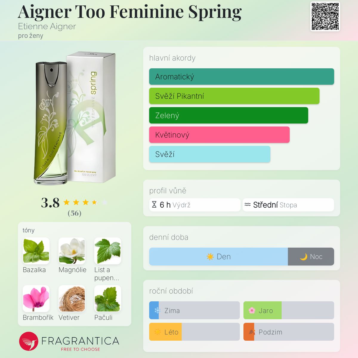 Aigner Too Feminine Spring podle Etienne Aigner je Floral vůně pro ženy. Aigner Too Feminine Spring byl/a uveden/a v roce 2007. Vrchní tóny jsou Bazalka a Kasie; střední tóny jsouMagnólie, Brambořík a Jasmín ; základní tóny jsou Vetiver, Pačuli, Ylang-Ylang a Pižmo.