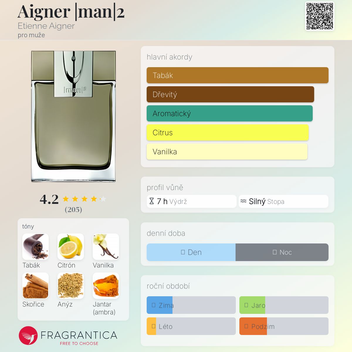 Aigner |man|2 podle Etienne Aigner je Woody Aromatic vůně pro muže. Aigner |man|2 byl/a uveden/a v roce 2007. Aigner |man|2 byl/a vytvořen/a Pierre Wargnye a Rosendo Mateu. Vrchní tóny jsou Sicilský citron a Šalvěj; střední tóny jsouSkořice, Anýz a Estragon ; základní tóny jsou Tabák, Vanilka, Jantar (ambra), Cedr, Kašmírové dřevo a Pačuli.