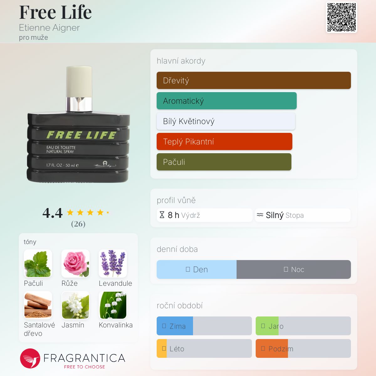 Free Life podle Etienne Aigner je Aromatic Spicy vůně pro muže. Free Life byl/a uveden/a v roce 1987. Vrchní tóny jsou Levandule, Palisandr, Šalvěj a Bergamot; střední tóny jsouPačuli, Růže, Jasmín, Konvalinka, Cedr a Pelargónie ; základní tóny jsou Santalové dřevo, Jantar (ambra), Vanilka a Fazole tonka.