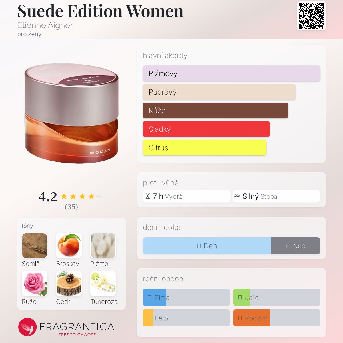 Suede Edition Women podle Etienne Aigner je Woody Floral Musk vůně pro ženy. Suede Edition Women byl/a uveden/a v roce 2005. "Nosem" za touto vůní je Ramon Monegal. Vrchní tóny jsou Broskev, Pomeranč a Yuzu; střední tóny jsouRůže, Tuberóza a Konvalinka ; základní tóny jsou Semiš, Pižmo, Cedr a Fazole tonka.
