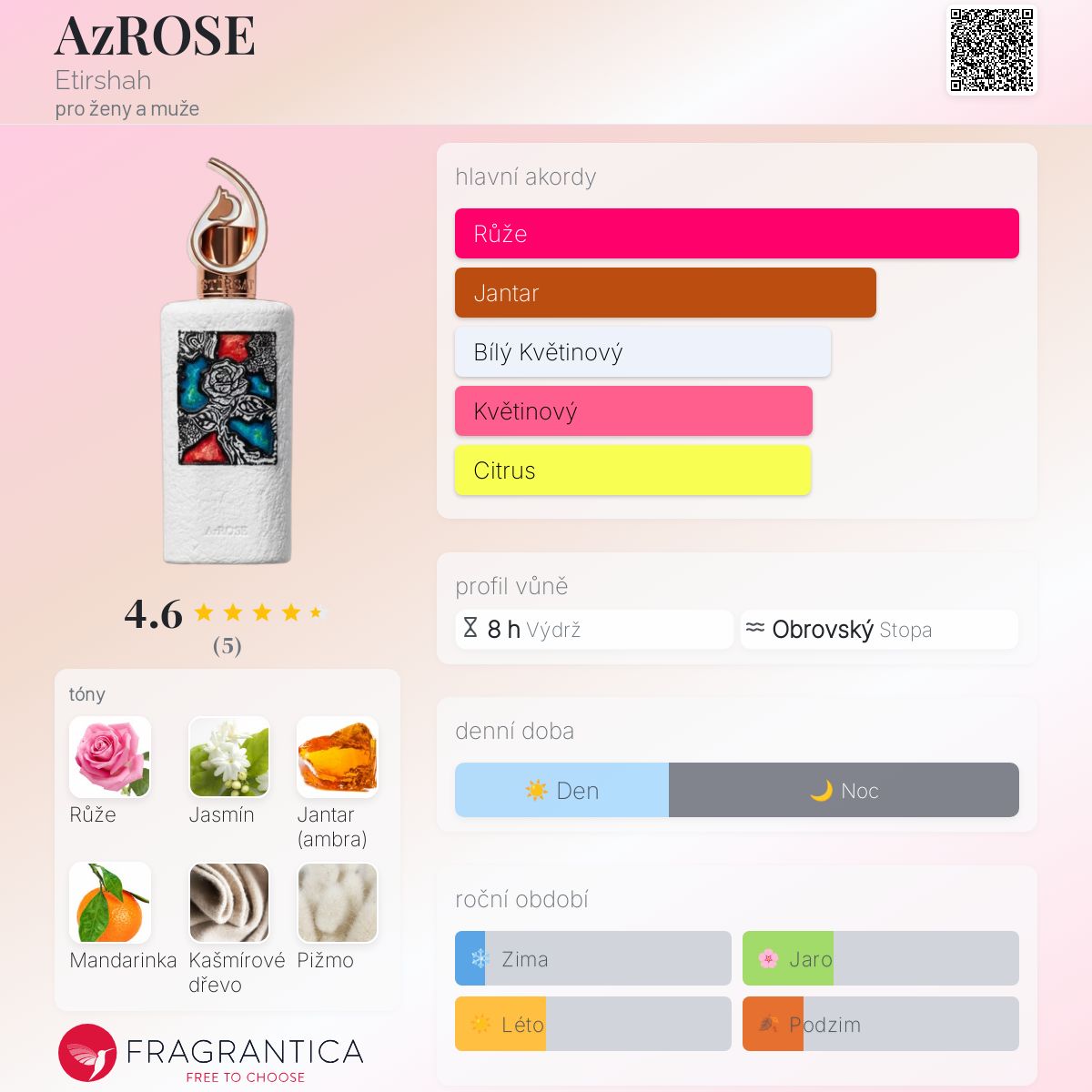 AzROSE podle Etirshah je Floral Woody Musk vůně pro ženy a muže. Toto je nová vůně. AzROSE byl/a uveden/a v roce 2024. "Nosem" za touto vůní je Christian Provenzano. Vrchní tóny jsou Růže a Mandarinka; střední tóny jsouRůže a Jasmín ; základní tóny jsou Jantar (ambra), Kašmírské dřevo a Pižmo.