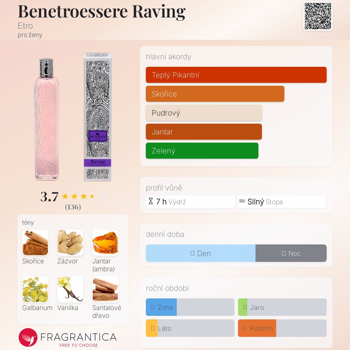 Benetroessere Raving podle Etro je Woody Spicy vůně pro ženy. Benetroessere Raving byl/a uveden/a v roce 2001. Vrchní tóny jsou Galbanum a Broskev; střední tóny jsouSkořice, Zázvor a Růže ; základní tóny jsou Jantar (ambra), Vanilka a Santalové dřevo.