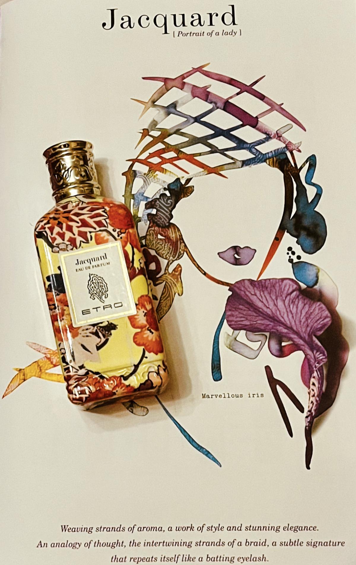 Jacquard podle Etro je Floral Woody Musk vůně pro ženy. Jacquard byl/a uveden/a v roce 2014. "Nosem" za touto vůní je Mathieu Nardin. Vrchní tóny jsou Andělika, Černý pepř, Elimi a Bergamot; střední tóny jsouKosatec, Ylang-Ylang a Jasmín ; základní tóny jsou Pižmo, Fialka, Vetiver a Santalové dřevo.