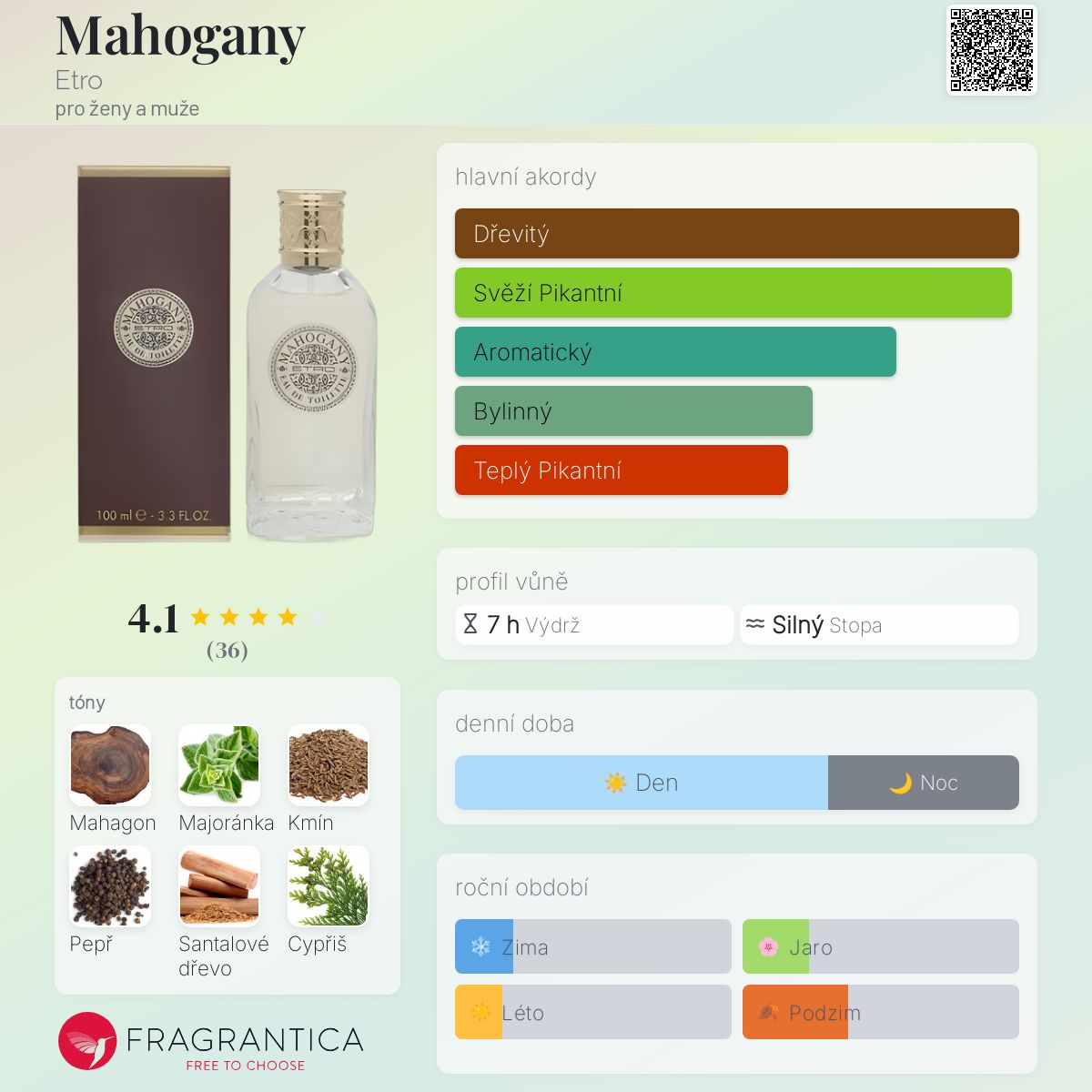 Mahogany podle Etro je Woody Spicy vůně pro ženy a muže. Mahogany byl/a uveden/a v roce 2004. Vrchní tóny jsou Majoránka a Bergamot; střední tóny jsouŘímský kmín, Pepř, Cypřiš a Hřebíček ; základní tóny jsou Mahagon, Santalové dřevo, Pižmo, Vetiver, Vanilka a Jantar (ambra).
