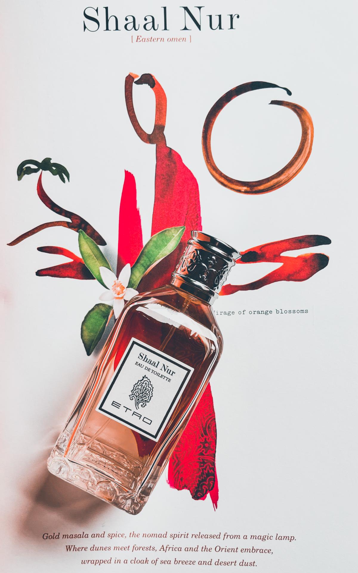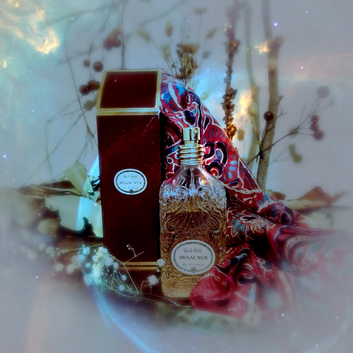 Shaal Nur podle Etro je Orientální Woody vůně pro ženy. Shaal Nur byl/a uveden/a v roce 1997. Vrchní tóny jsou Bergamot, Koriandr, Citrón, Brazilské růžové dřevo, Grapefruit a Mandarinka; střední tóny jsouRozmarýn, Estragon, Tymián, Petitgrain, Růže a Karo Karounde ; základní tóny jsou Vetiver, Kadidlo, Opoponax, Pačuli, Muškátový oříšek, Cedr a Pižmo.