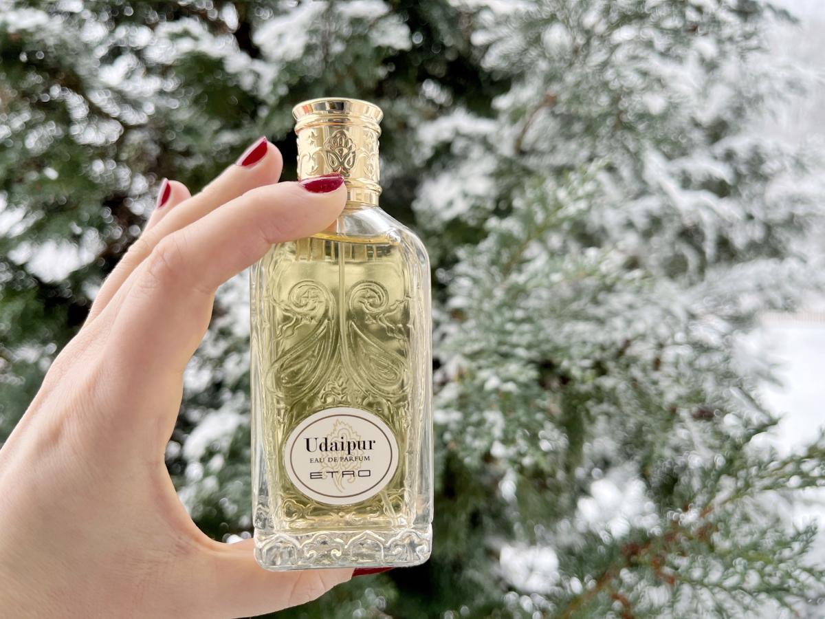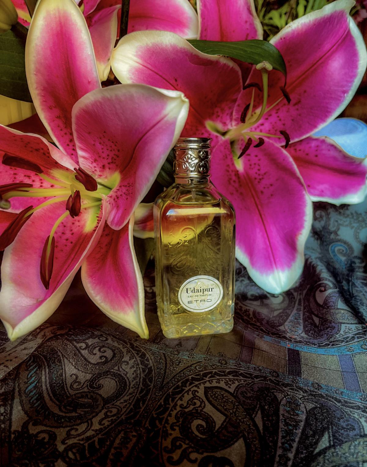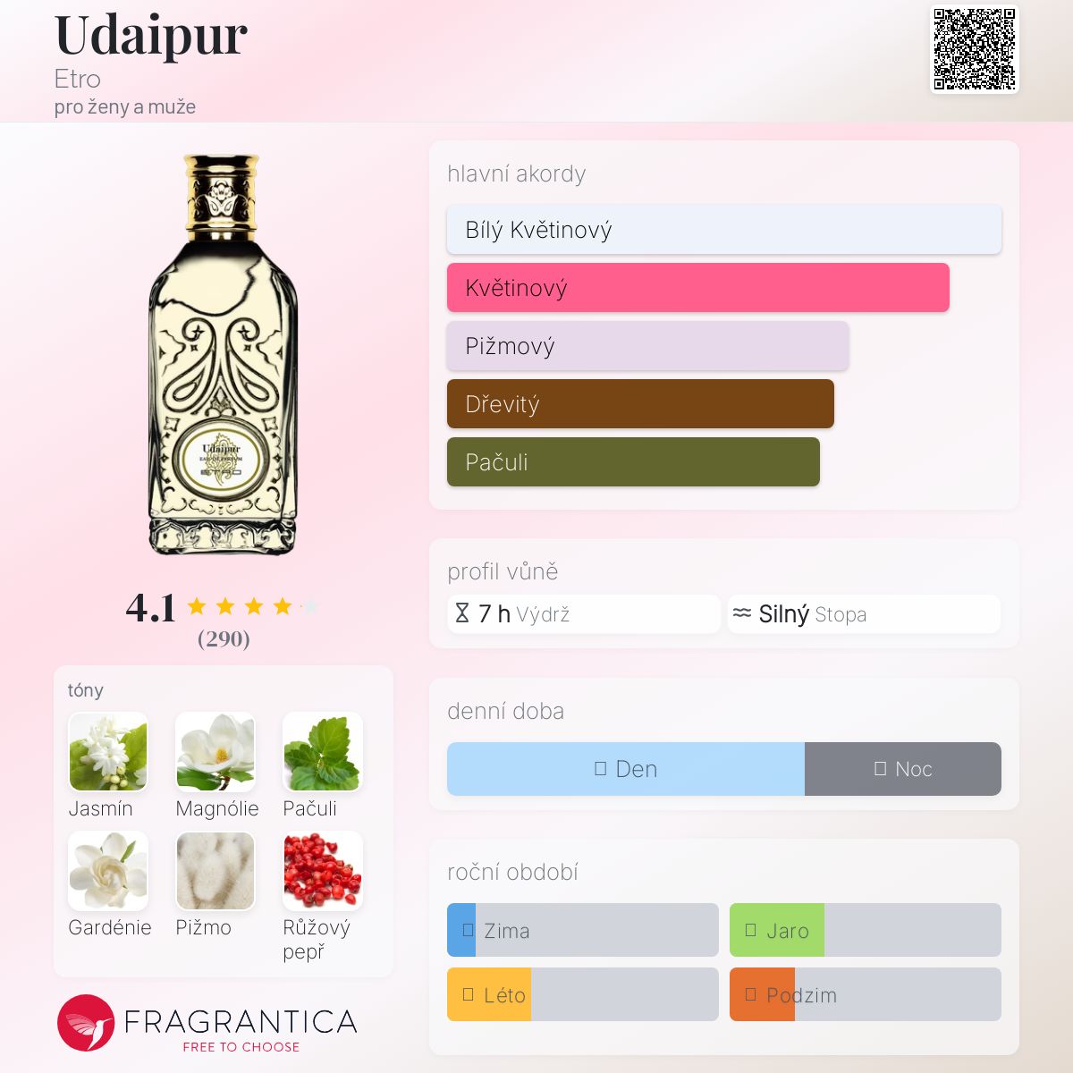 Udaipur podle Etro je Floral Woody Musk vůně pro ženy a muže. Udaipur byl/a uveden/a v roce 2018. "Nosem" za touto vůní je Mathieu Nardin. Vrchní tóny jsou Magnólie, Růžový pepř a Bergamot; střední tóny jsouJasmín Sambac, Gardénie a Lotus ; základní tóny jsou Pačuli, Pižmo a Kašmírové dřevo.