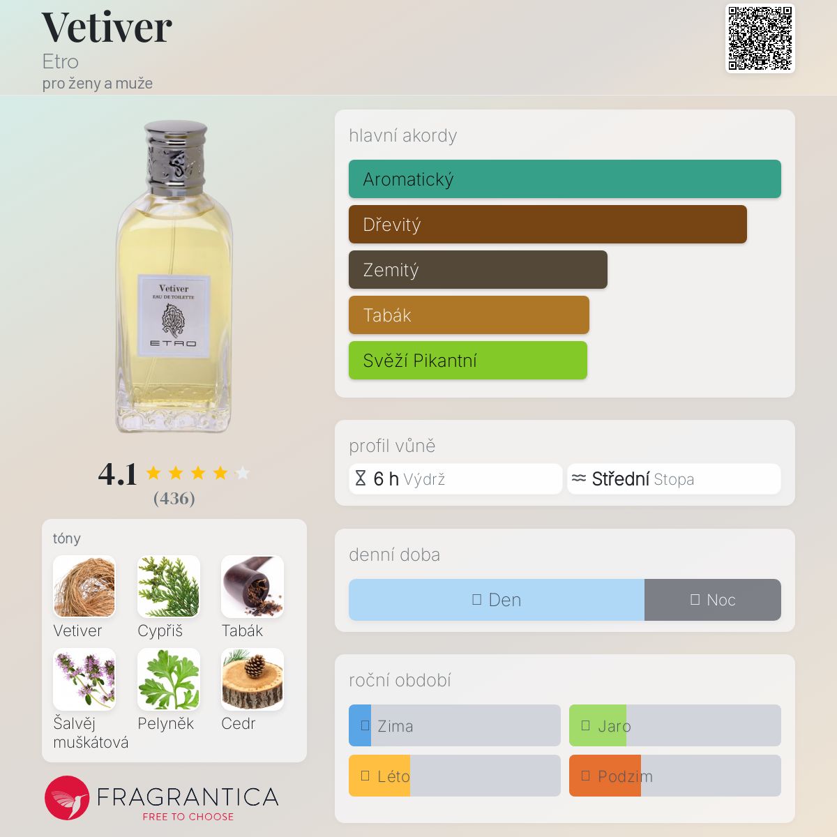 Vetiver podle Etro je Woody vůně pro ženy a muže. Vetiver byl/a uveden/a v roce 1989. Vrchní tóny jsou Šalvěj muškátová, Pelyněk, Bergamot a Petitgrain; střední tóny jsouVetiver, Cypřiš a Cedr ; základní tóny jsou Tabák, Jantar (ambra) a Pižmo.