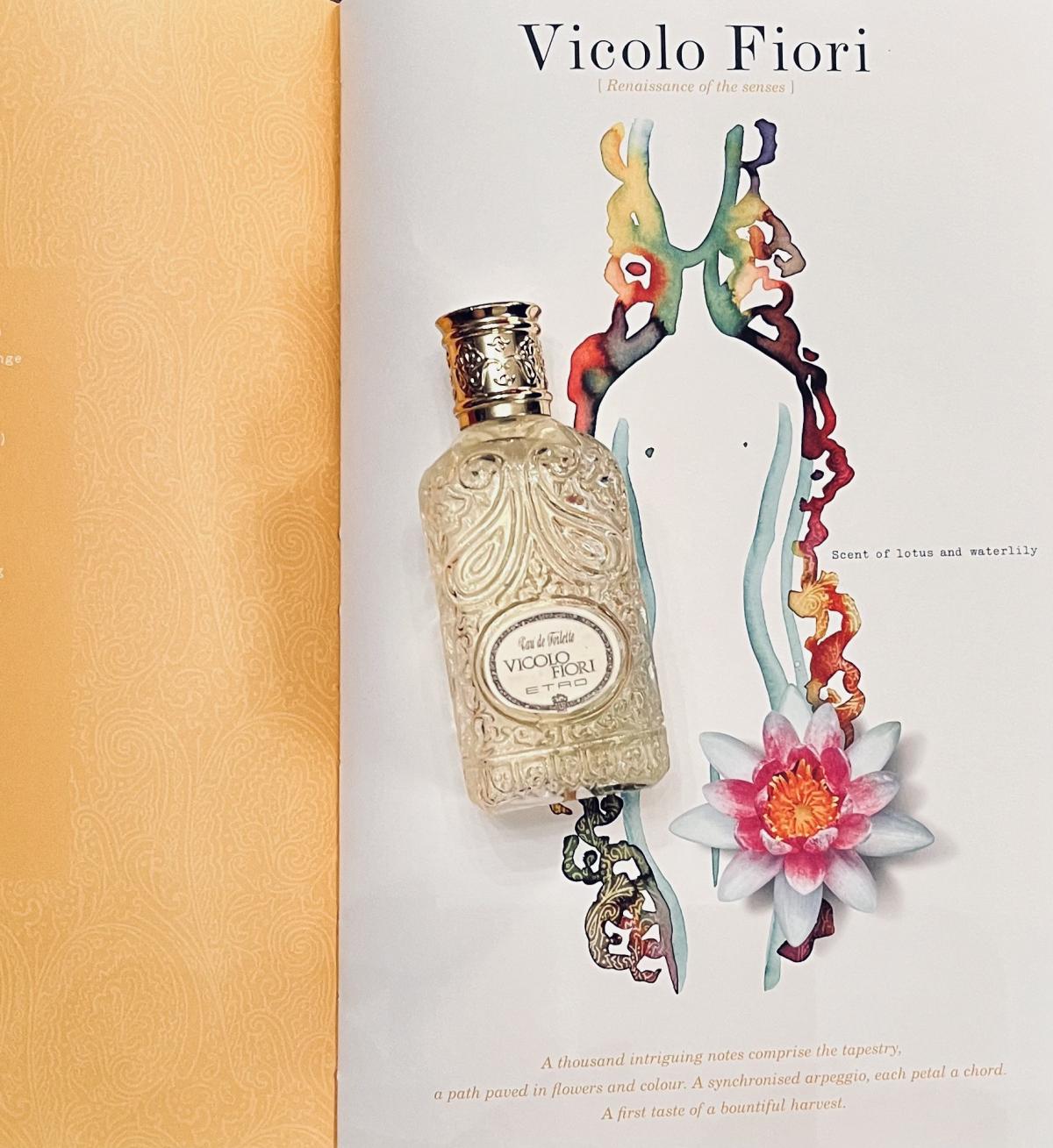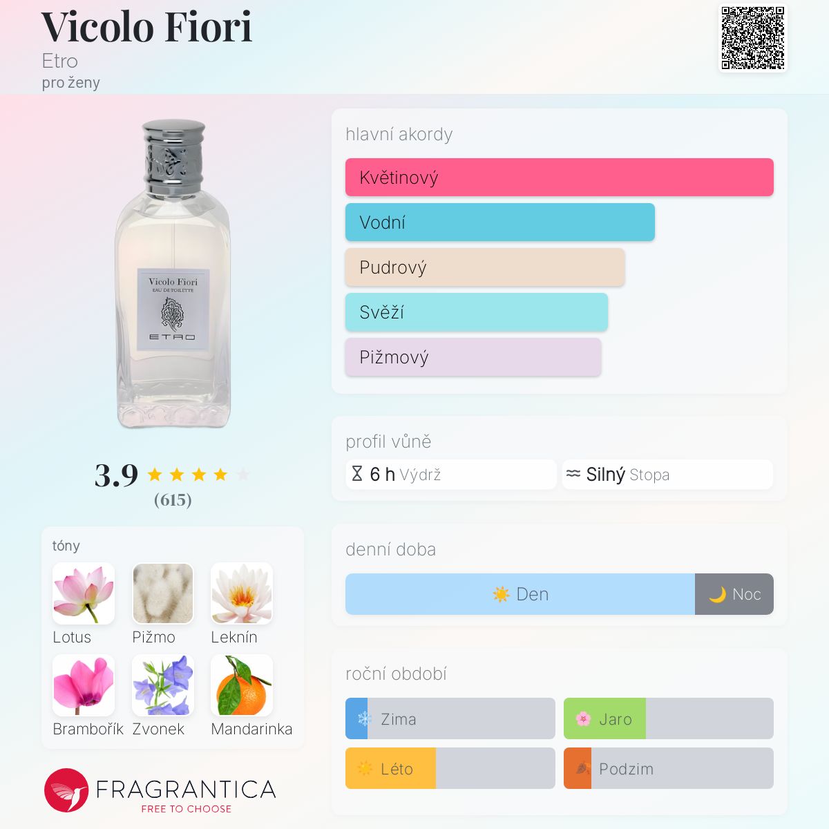 Vicolo Fiori podle Etro je Floral Fruity vůně pro ženy. Vicolo Fiori byl/a uveden/a v roce 1996. Vrchní tóny jsou Zvonek a Mandarinka; střední tóny jsouLotus, Leknín, Brambořík, Meloun, Ylang-Ylang, Šípek a Bílá broskev ; základní tóny jsou Pižmo, Kosatec, Santalové dřevo, Vanilka a Jantar (ambra).