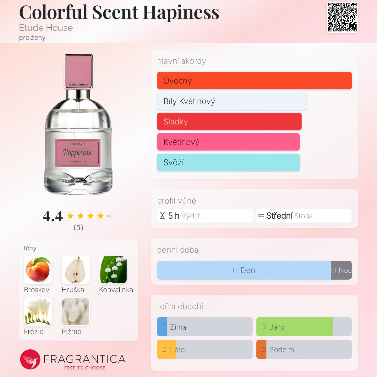 Colorful Scent Hapiness podle Etude House je Floral Fruity vůně pro ženy. Colorful Scent Hapiness byl/a uveden/a v roce 2016. Vrchní tóny jsou Broskev a Hruška; střední tóny jsouKonvalinka a Frézie ; základní tón je Pižmo.