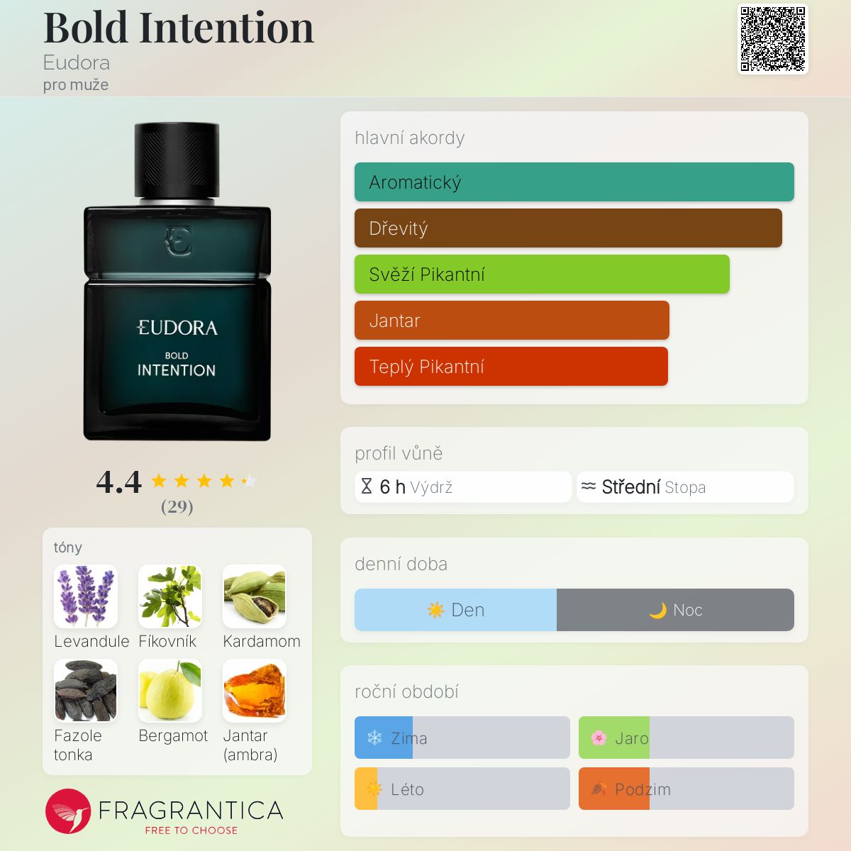 Bold Intention podle Eudora je Orientální Fougere vůně pro muže. Toto je nová vůně. Bold Intention byl/a uveden/a v roce 2025. Vrchní tóny jsou Kardamom, Bergamot, Rozmarýn, Zázvor a Jalovec; střední tóny jsouLevandule, Pekanový ořech a Kokosová voda ; základní tóny jsou Fíkovník, Fazole tonka, Jantar (ambra), Santalové dřevo, Kašmír a Pačuli.