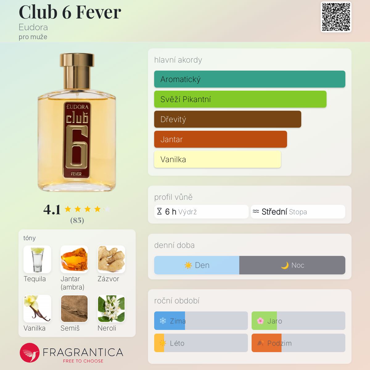 Club 6 Fever podle Eudora je Orientální Woody vůně pro muže. Toto je nová vůně. Club 6 Fever byl/a uveden/a v roce 2024. Vrchní tóny jsou Zázvor, Černý pepř a Jalovec; střední tóny jsouTequila, Neroli, Rozmarýn a Cedr ; základní tóny jsou Jantar (ambra), Vanilka, Semiš, Dub, Vetiver a Pačuli.