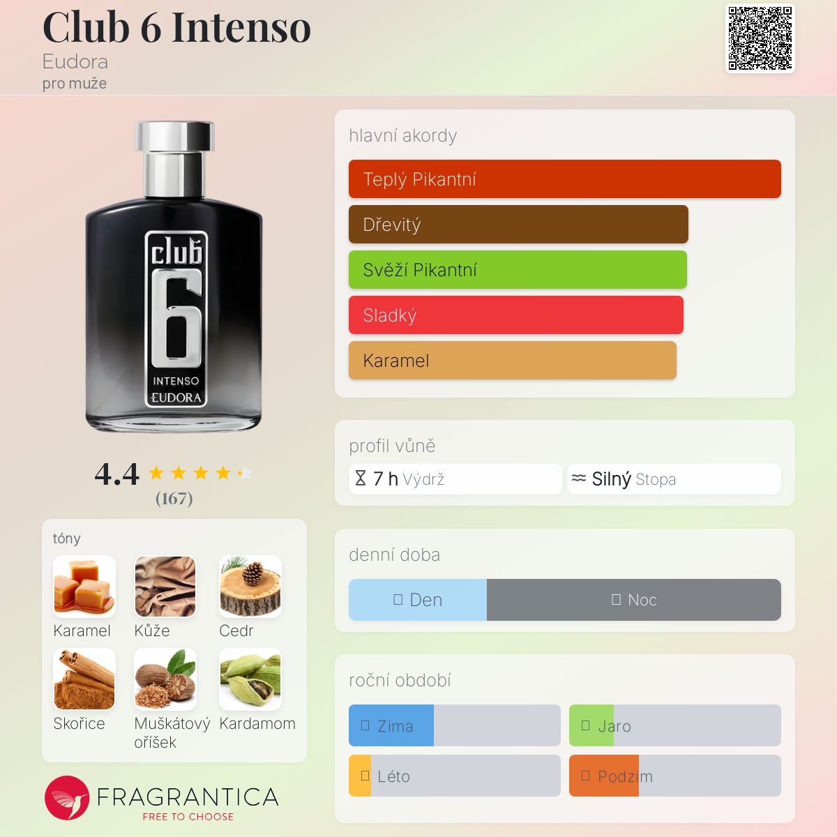 Club 6 Intenso podle Eudora je Orientální Woody vůně pro muže. Club 6 Intenso byl/a uveden/a v roce 2023. Vrchní tóny jsou Kardamom, Ananas, Šafrán, Citrón a Bergamot; střední tóny jsouSkořice, Muškátový oříšek, Levandule a Pelargónie ; základní tóny jsou Karamel, Kůže, Cedr, Vanilka, Jantar (ambra), Fazole tonka, Santalové dřevo, Pačuli, Mech a Labdanum.