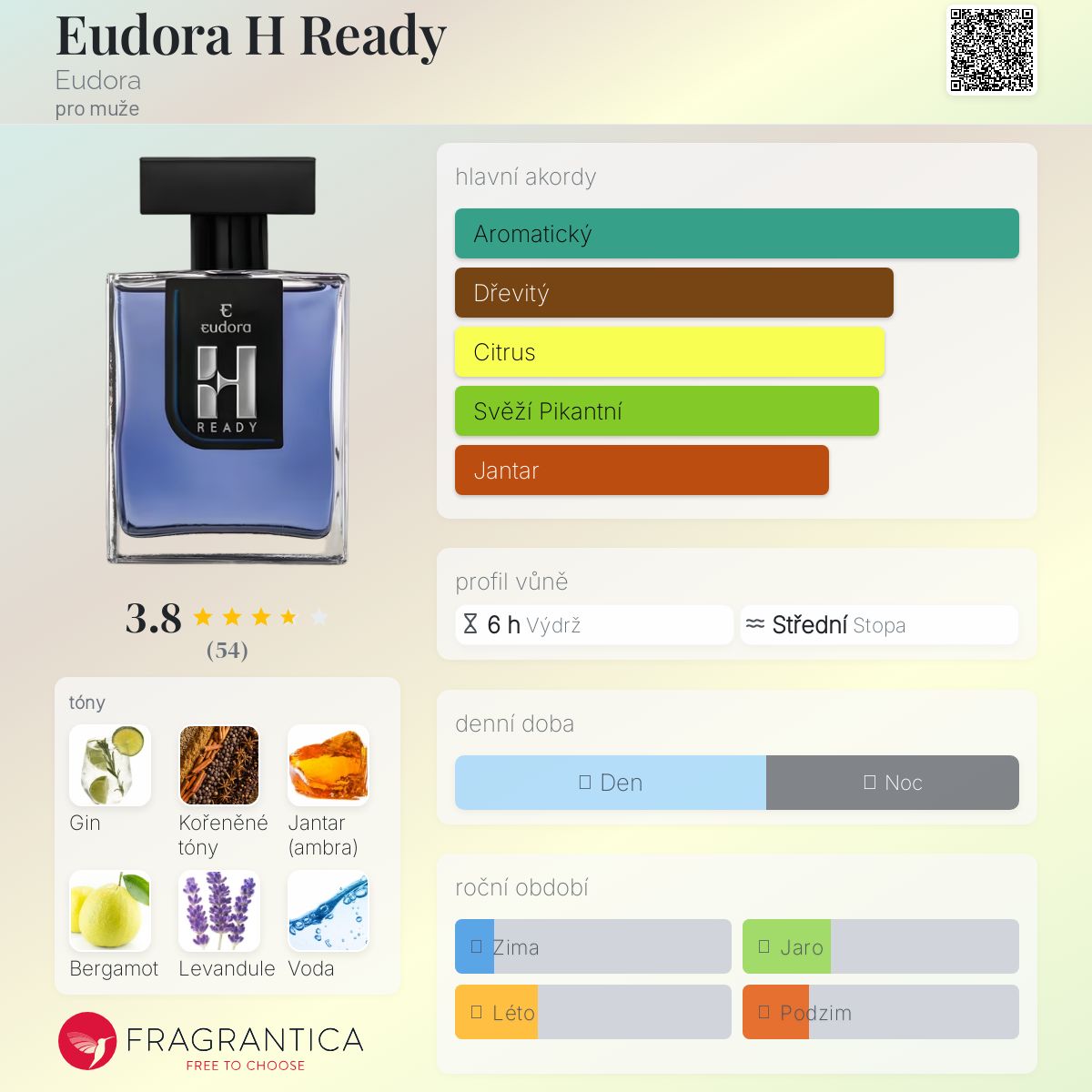 Eudora H Ready podle Eudora je Aromatic Fougere vůně pro muže. Eudora H Ready byl/a uveden/a v roce 2022. Vrchní tóny jsou Gin, Koření, Bergamot, Vodnaté tóny a Sicilský citron; střední tóny jsouLevandule, Pelargónie a Cedrové listy ; základní tóny jsou Jantar (ambra), Mech a Dřevité tóny.