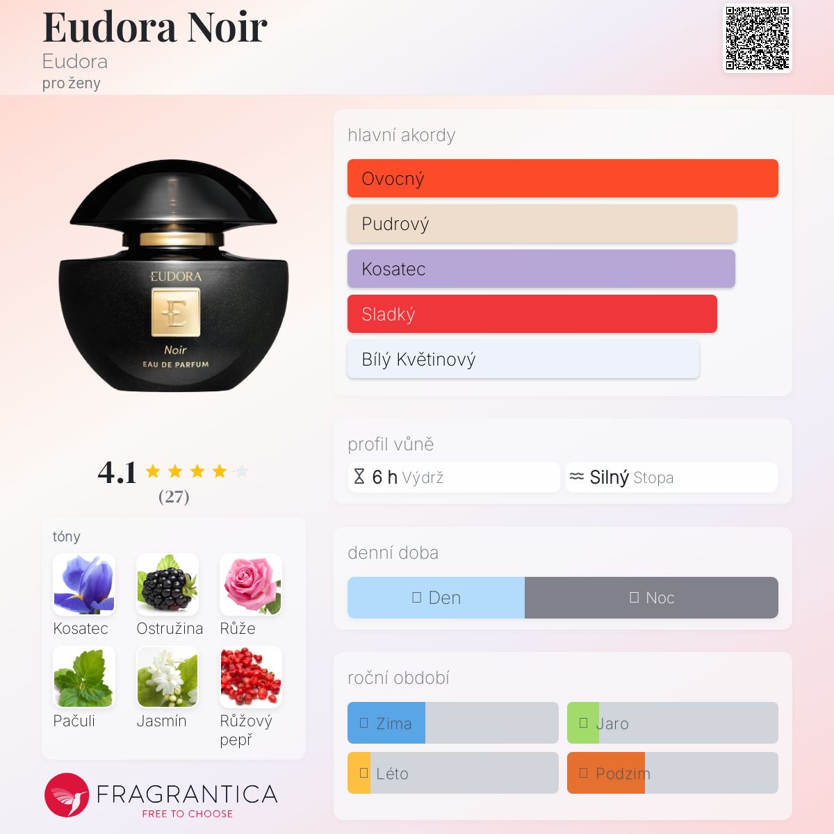Eudora Noir podle Eudora je Chypre vůně pro ženy. Toto je nová vůně. Eudora Noir byl/a uveden/a v roce 2025. "Nosem" za touto vůní je Sophie Labbé. Vrchní tóny jsou Ostružina, Růžový pepř, Bergamot, Švestka a Sirup; střední tóny jsouKvět kosatce, Damašská růže, Jasmín Sambac, Jasmín, Vonokvětka a Konvalinka ; základní tóny jsou Pačuli, Vanilka, Jantar (ambra), Kašmír a Pralinka.