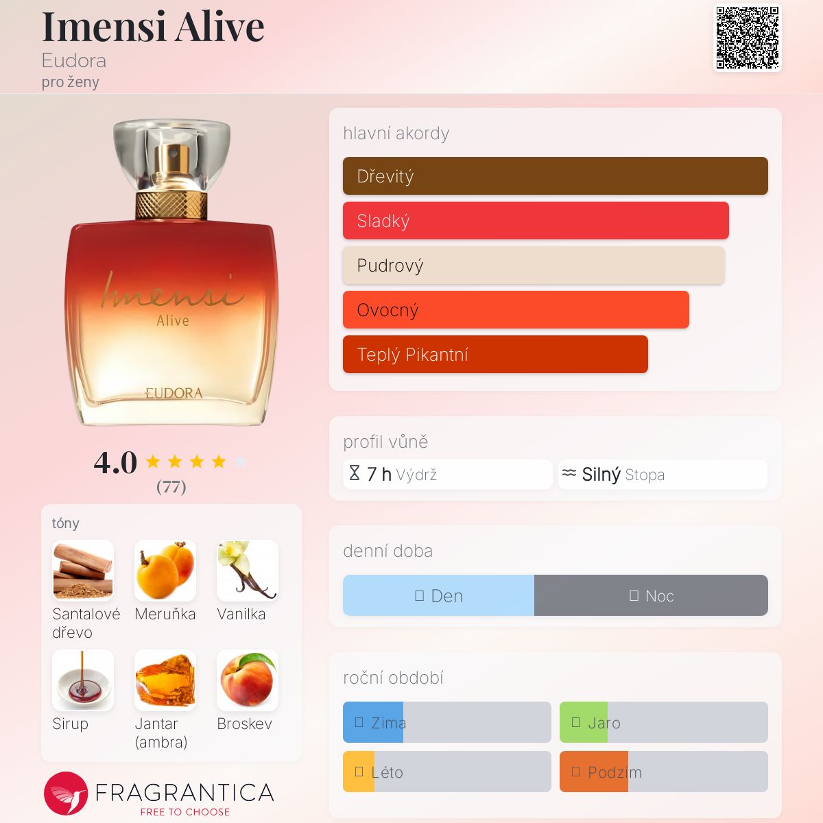 Imensi Alive podle Eudora je Floral Fruity vůně pro ženy. Imensi Alive byl/a uveden/a v roce 2022. Vrchní tóny jsou Meruňka, Sirup, Broskev, Maliny, Jablko, Mandarinka a Černý pepř; střední tóny jsouYlang-Ylang, Gardénie, Hřebíček, Růže, Jasmín, Orchidej a Pomerančový květ ; základní tóny jsou Santalové dřevo, Vanilka, Křišťálový jantar, Cedr, Kašmír, Benzoin, Pižmo a Pačuli.