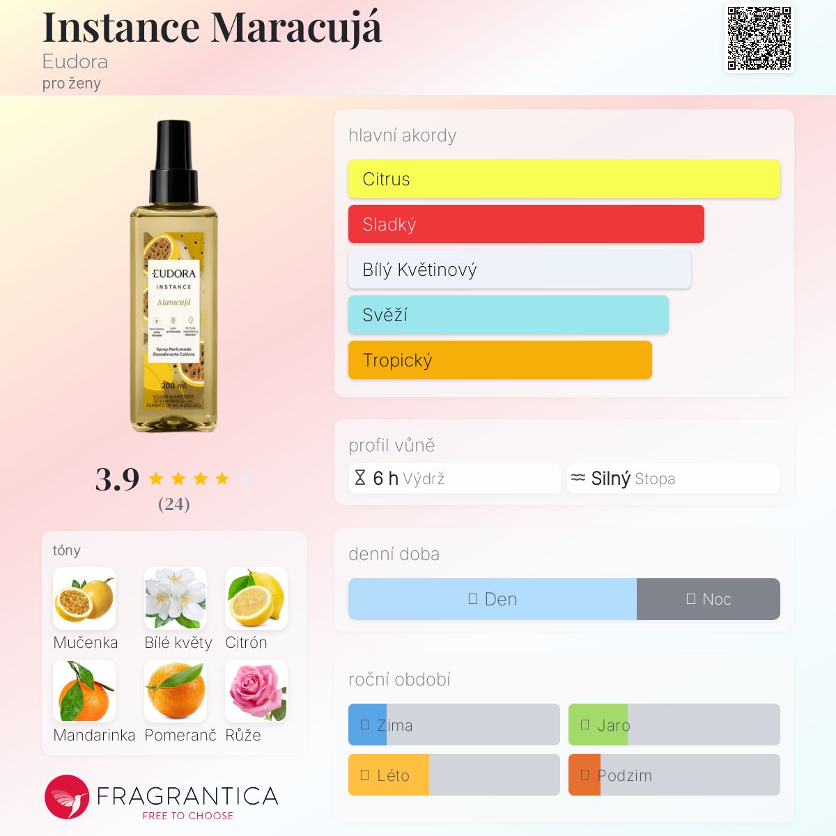 Instance Maracujá podle Eudora je Floral Fruity vůně pro ženy. Toto je nová vůně. Instance Maracujá byl/a uveden/a v roce 2024. Vrchní tóny jsou Citrón, Mandarinka a Pomeranč; střední tóny jsouMučenka, Bílé květy, Růže, Vodnaté tóny a Fialka ; základní tóny jsou Pižmo, Vanilka, Jantar (ambra), Cedr a Pralinka.