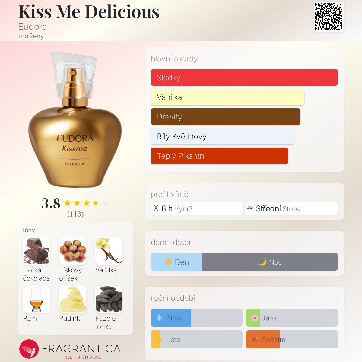 Kiss Me Delicious podle Eudora je Orientální Floral vůně pro ženy. Toto je nová vůně. Kiss Me Delicious byl/a uveden/a v roce 2024. Vrchní tóny jsou Lískový oříšek, Pudink a Bergamot; střední tóny jsouČokoláda, Rum, Gardénie, Jasmín Sambac, Pomerančový květ a Accord Eudora® ; základní tóny jsou Vanilka, Fazole tonka a Santalové dřevo.