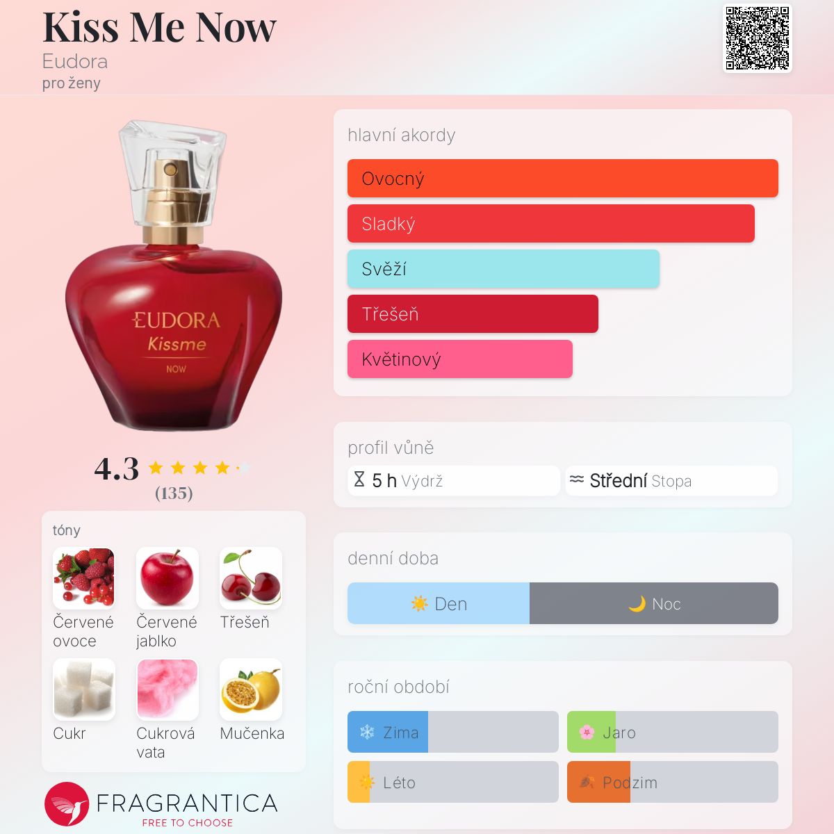 Kiss Me Now podle Eudora je Orientální Floral vůně pro ženy. Kiss Me Now byl/a uveden/a v roce 2022. "Nosem" za touto vůní je Gabriela Maldonado. Vrchní tóny jsou Červené ovoce, Červené jablko, Třešeň a Mučenka; střední tóny jsouCukr, Liči, Pivoňka, Jasmín a Leknín ; základní tóny jsou Cukrová vata, Pižmo, Santalové dřevo a Cedr.