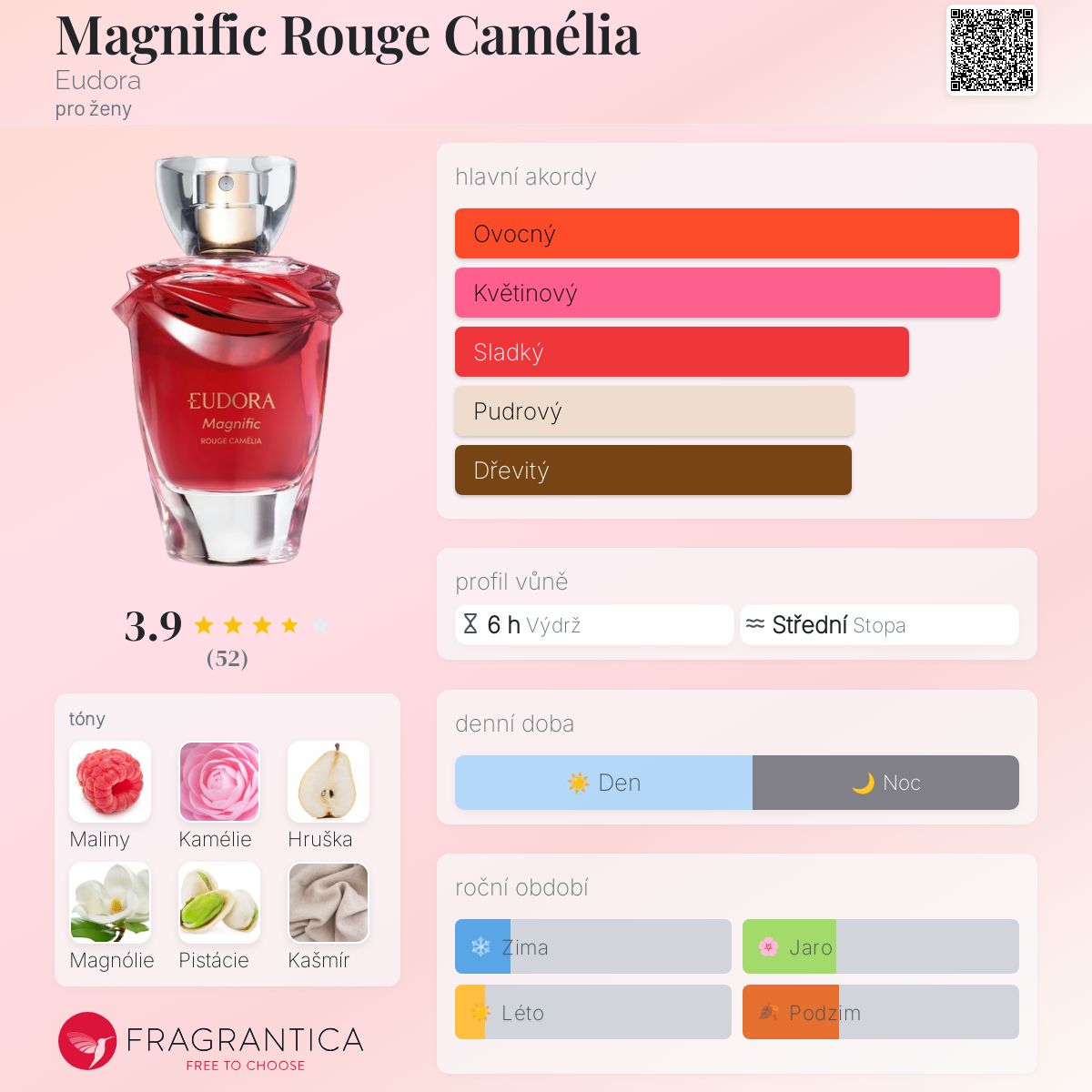Magnific Rouge Camélia podle Eudora je Floral vůně pro ženy. Toto je nová vůně. Magnific Rouge Camélia byl/a uveden/a v roce 2024. Vrchní tóny jsou Maliny, Hruška a Pistácie; střední tóny jsouKamélie, Magnólie a Jasmín ; základní tóny jsou Kašmír, Pačuli a Černý diamant.
